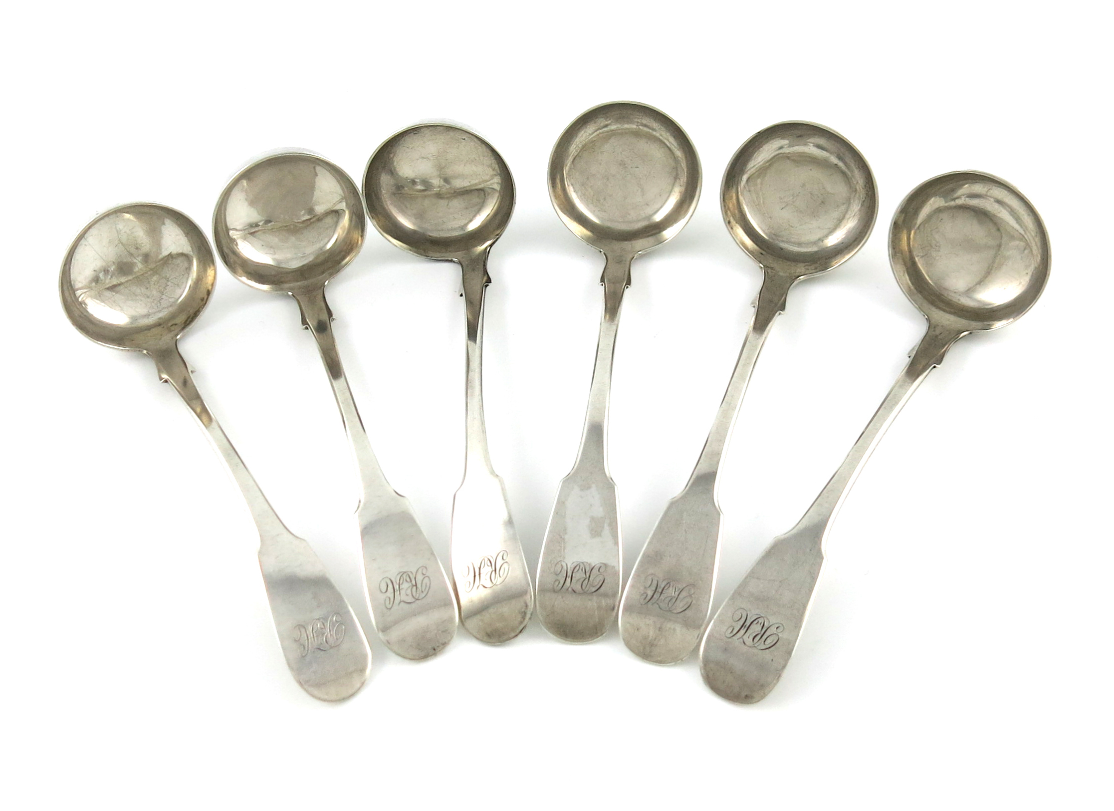 the terminals with initials, circular bowls, approx. weight 6.5oz. (6)