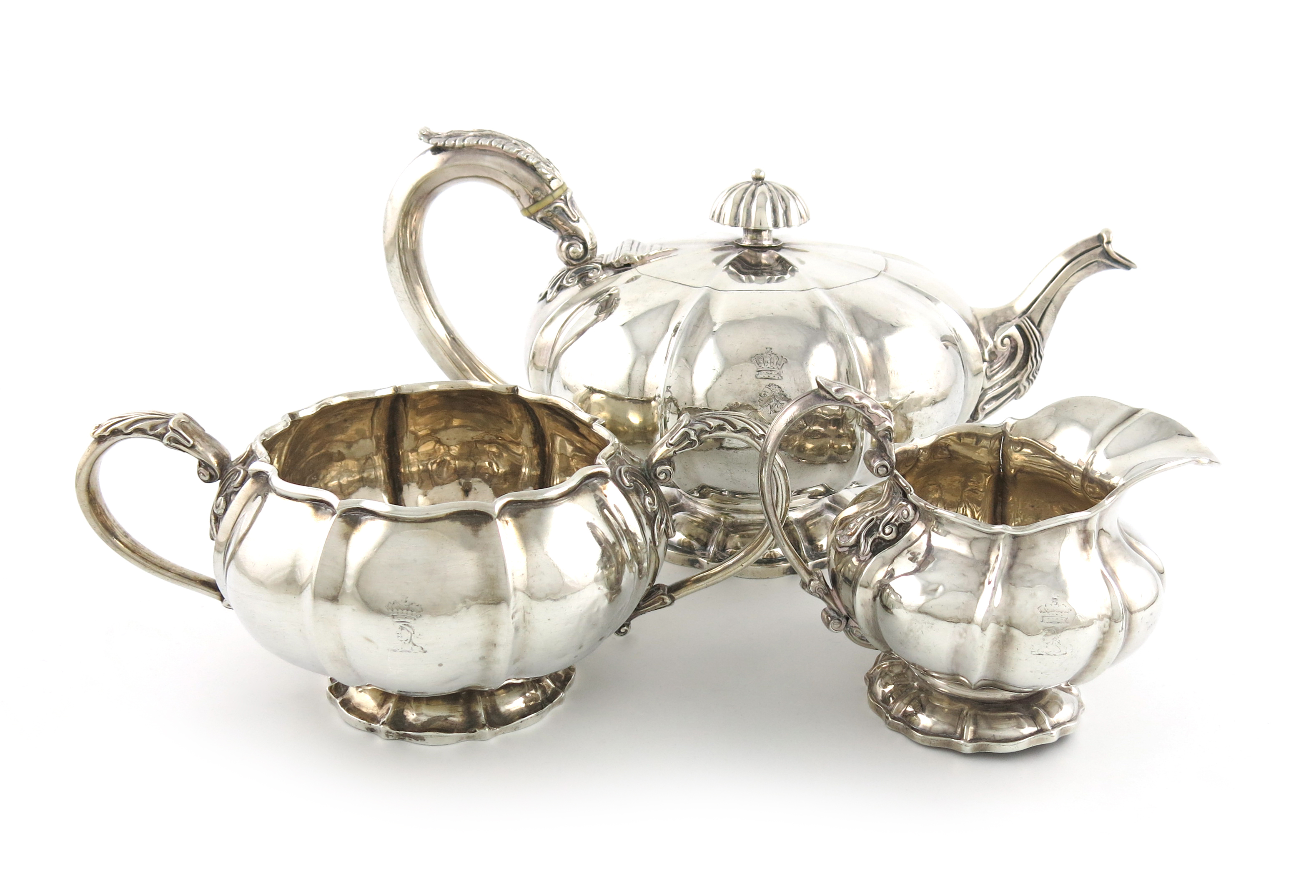 circular lobed form, leaf capped scroll handles, the teapot with a fluted spout and scroll handle with ivory insulators, on a shaped circular foot, engraved with a crest, length handle to spout 29.7cm, approx. weight 57oz. (3)