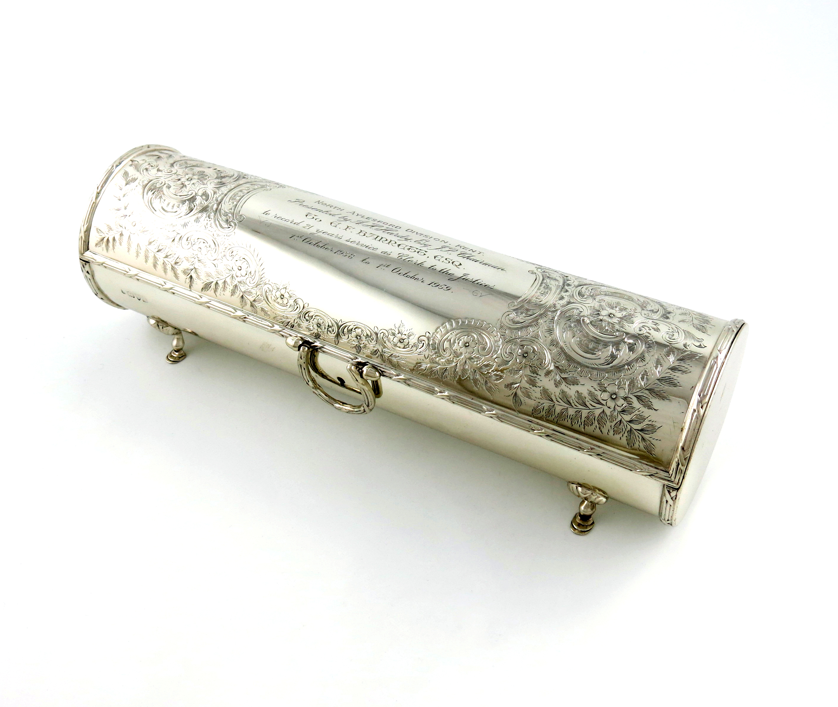 cylindrical form, the hinged cover with a hinged handle, engraved foliate scroll decoration and with a presentation inscription' North Aylesford Division Kent, presented by A.H Hardy Esq. J.P, Chairman, to E.F Barrett Esq. to record 21 years service as Clerk to the Justices, 1st October 1938 to 1st October 1959', on four shell capped hoof feet, length 36cm, approx. weight 55oz.