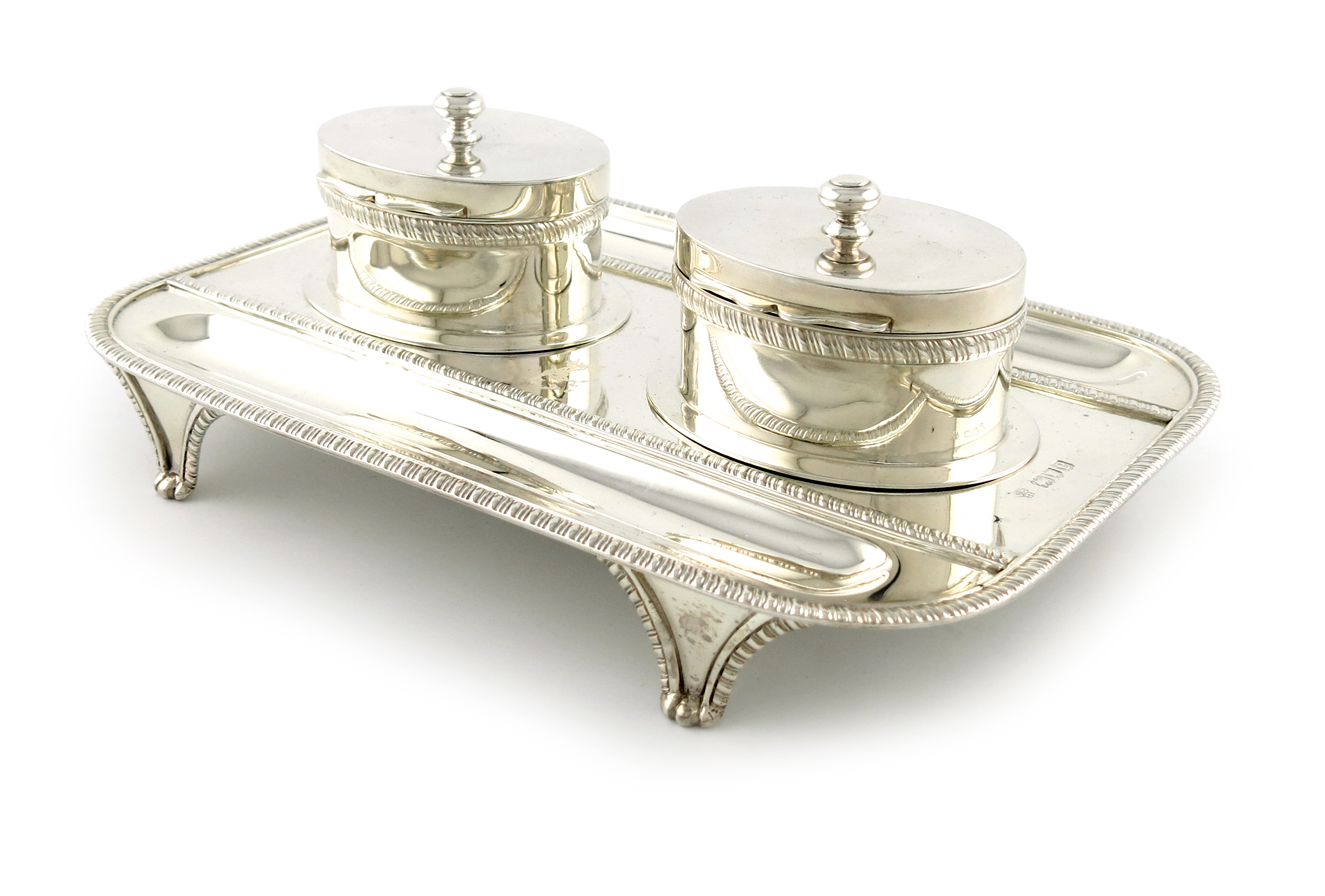 rounded rectangular form, with two pen wells, gadroon borders, with two oval inkwells, hinged covers, knop finials, glass liners, on four bracket feet, length 22.3cm, approx. weight 20oz.