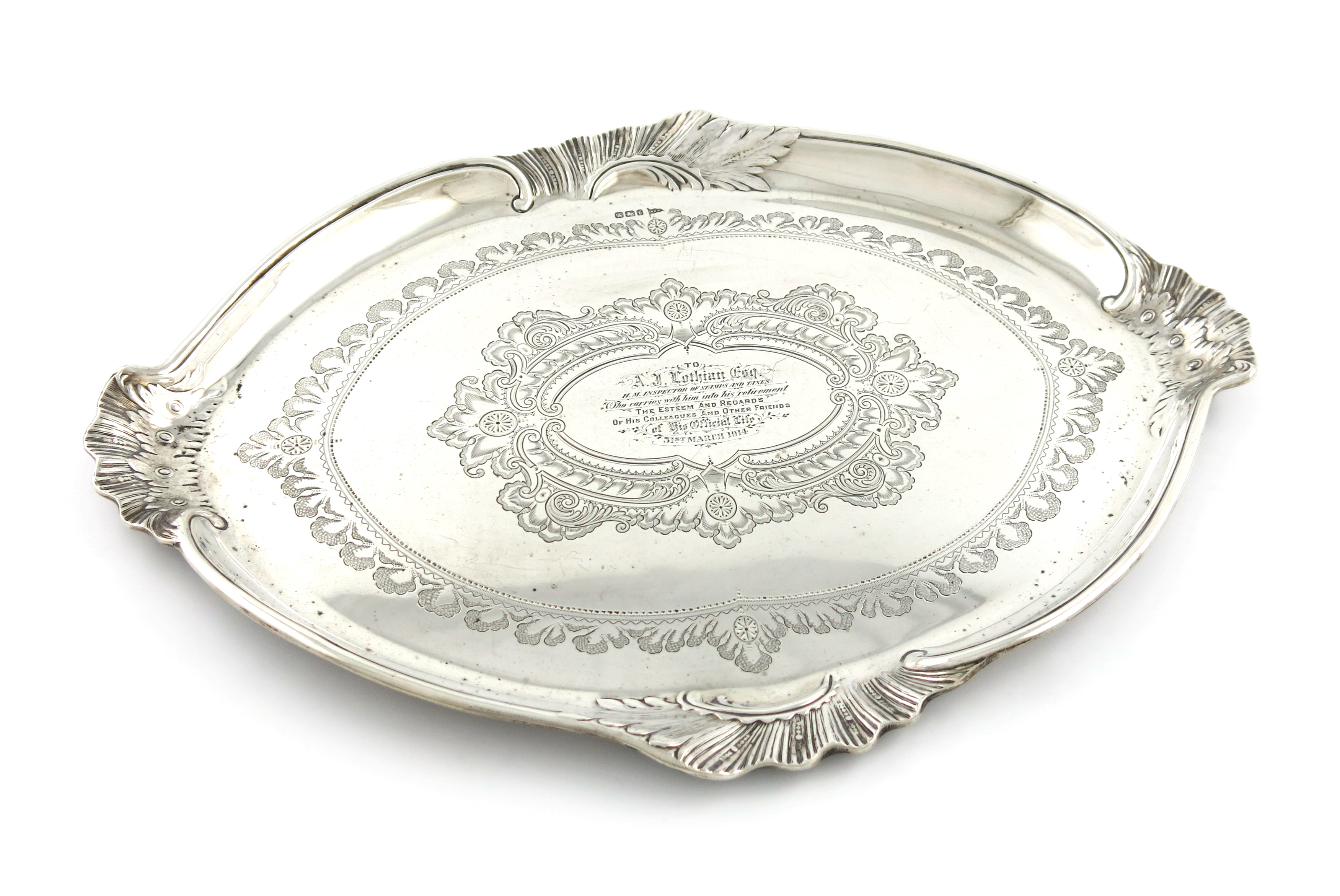 oval form, with a shaped border and shell handles, engraved shell decoration, the centre with a presentation inscription, length 46.2cm, approx. weight 38.3oz.