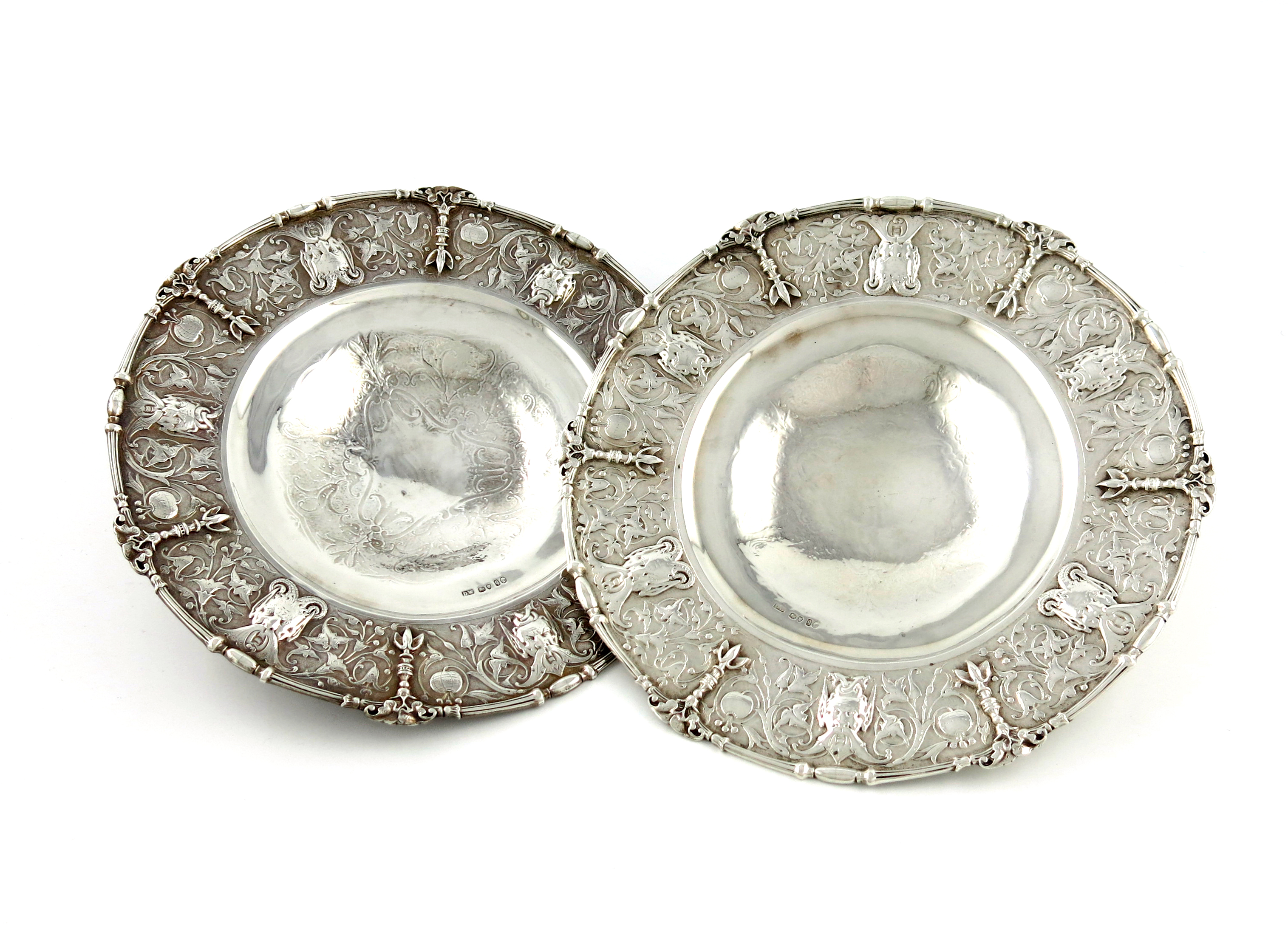 circular form, embossed with satyr masks and foliate decoration, the underside with chased foliate decoration, with screw threads, lacking bases, diameter 26.8cm, approx. weight 35oz. (2)