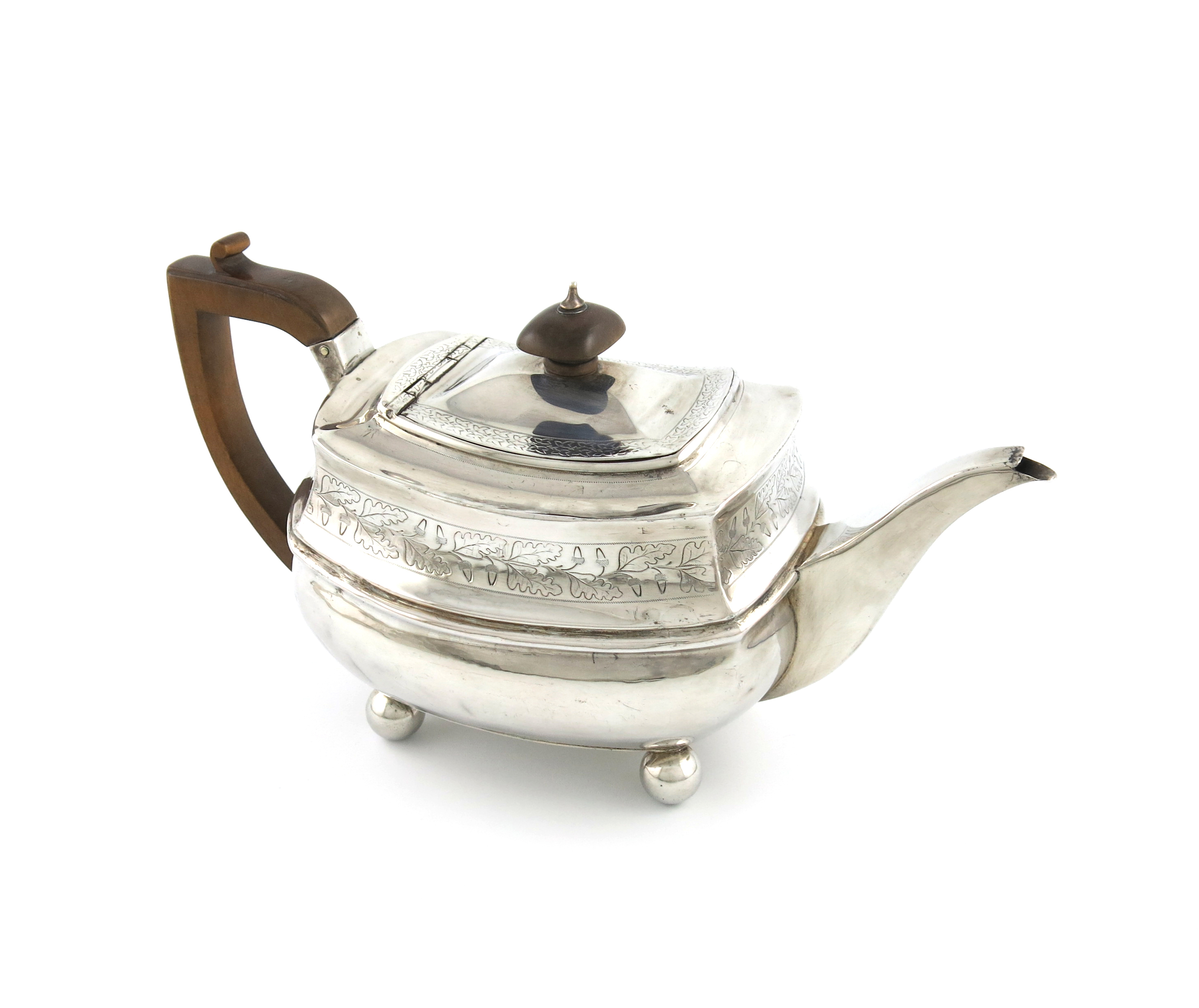 rounded rectangular form, wooden scroll handle and finial, engraved oak leaf girdle, on four ball feet, length handle to spout 27cm, approx. weight 14.5oz.