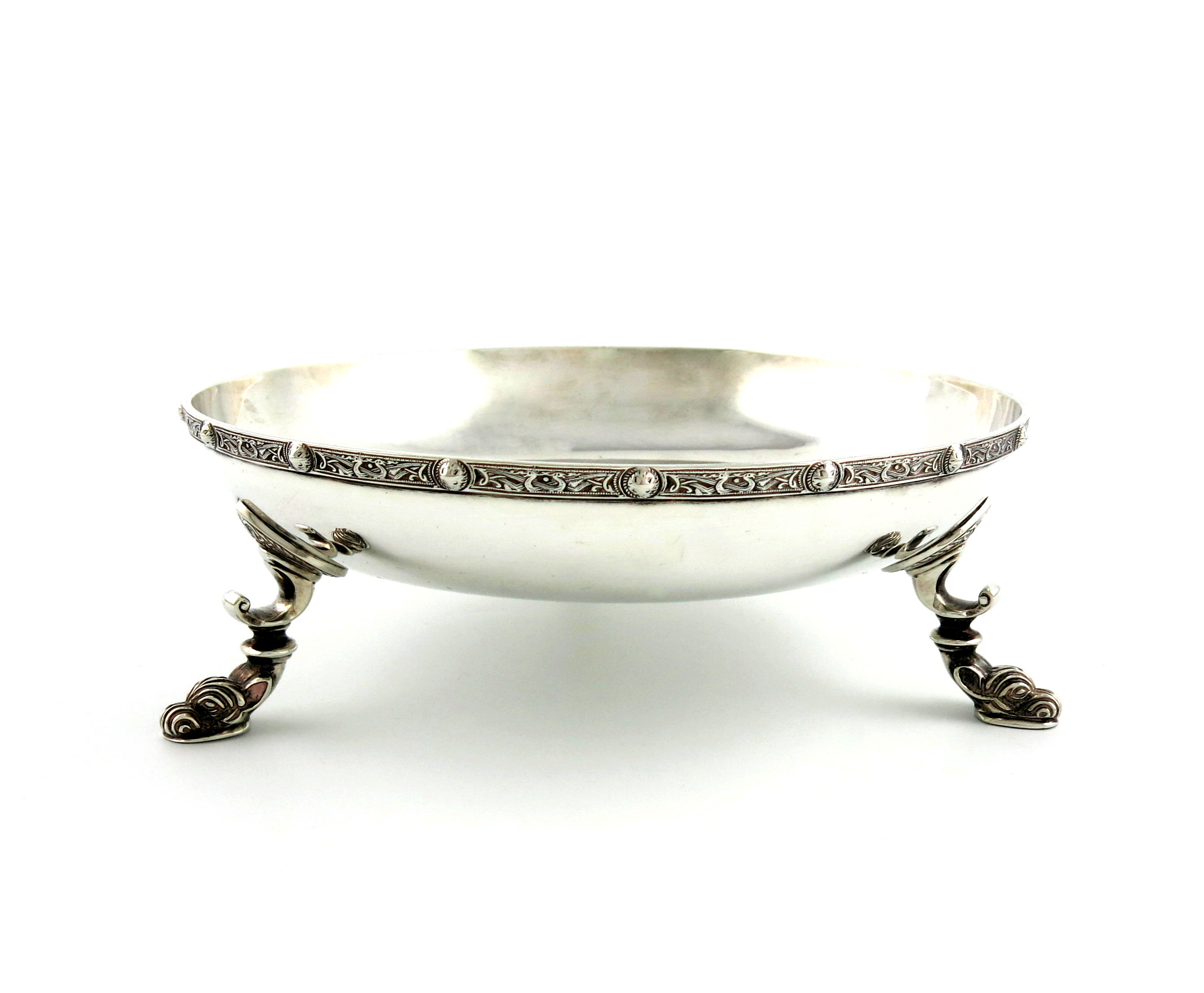 shallow circular form, Celtic border, on three Celtic motif mounted scroll legs terminating in mythical mask feet, diameter 22.7cm, approx. weight 22.5oz.