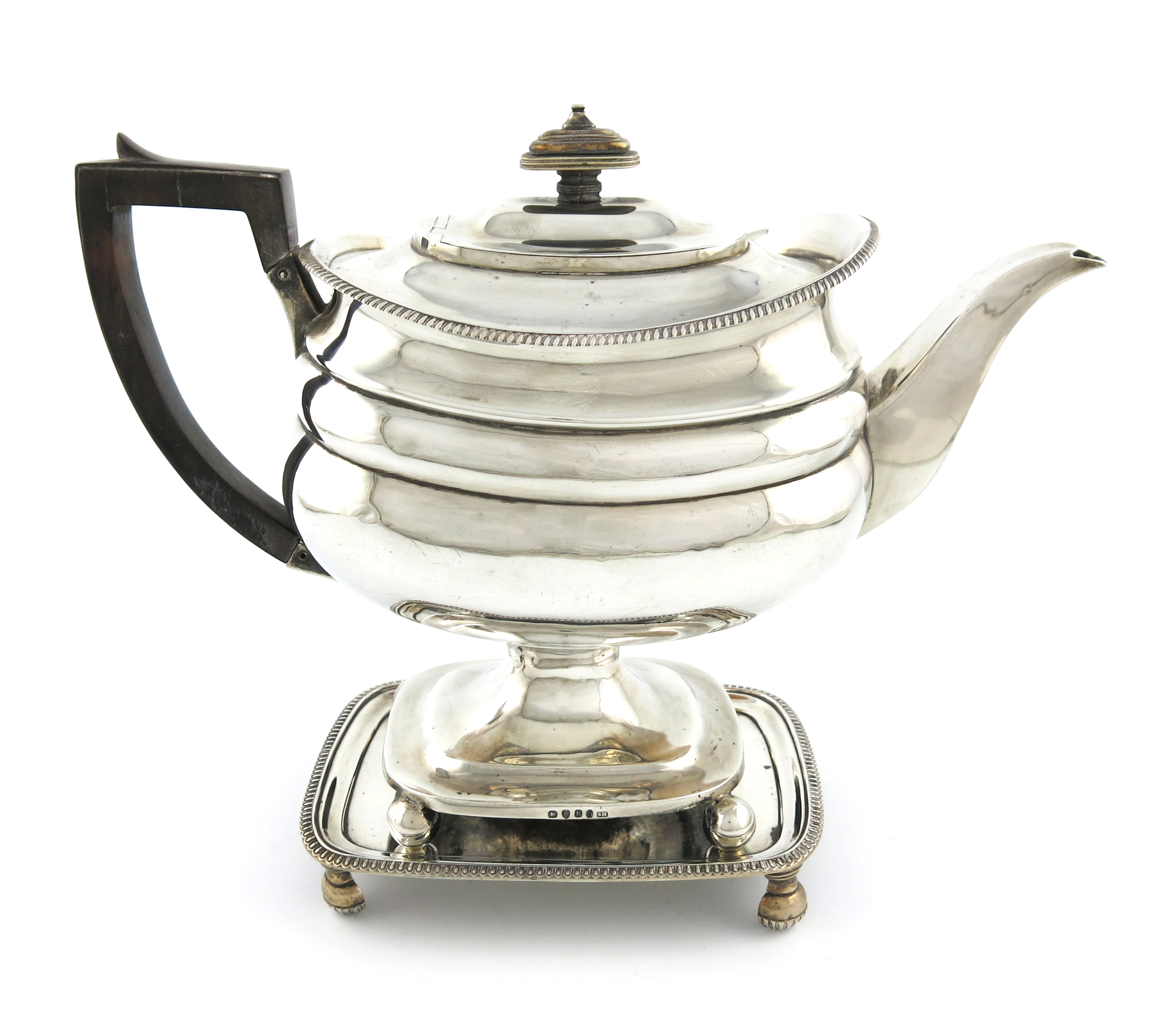 oblong bellied form, scroll handle, gadroon border, flush hinged domed cover with an ivory finial, scroll handle, on four ball feet, the stand of rounded rectangular form, initialled, gadroon border on four fluted bun feet, length handle to spout 31cm, approx. weight 34.5oz. (2)