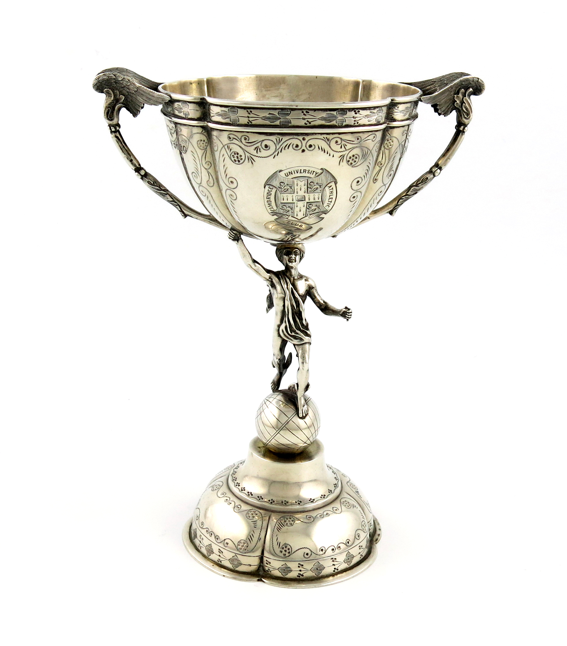 the stem modelled as Mars standing on a globe, supporting a lobed circular bowl with bifurcated wing scroll handles, on a raised lobed circular foot, engraved decoration, with arms of Cambridge University Athletic Club, the reverse inscribed 'Hurdle Race, 17 March 1874, won by W.C.R. Bedford, Clare Coll. Time 171/5 seconds', height 25.2cm, approx. weight 16oz.