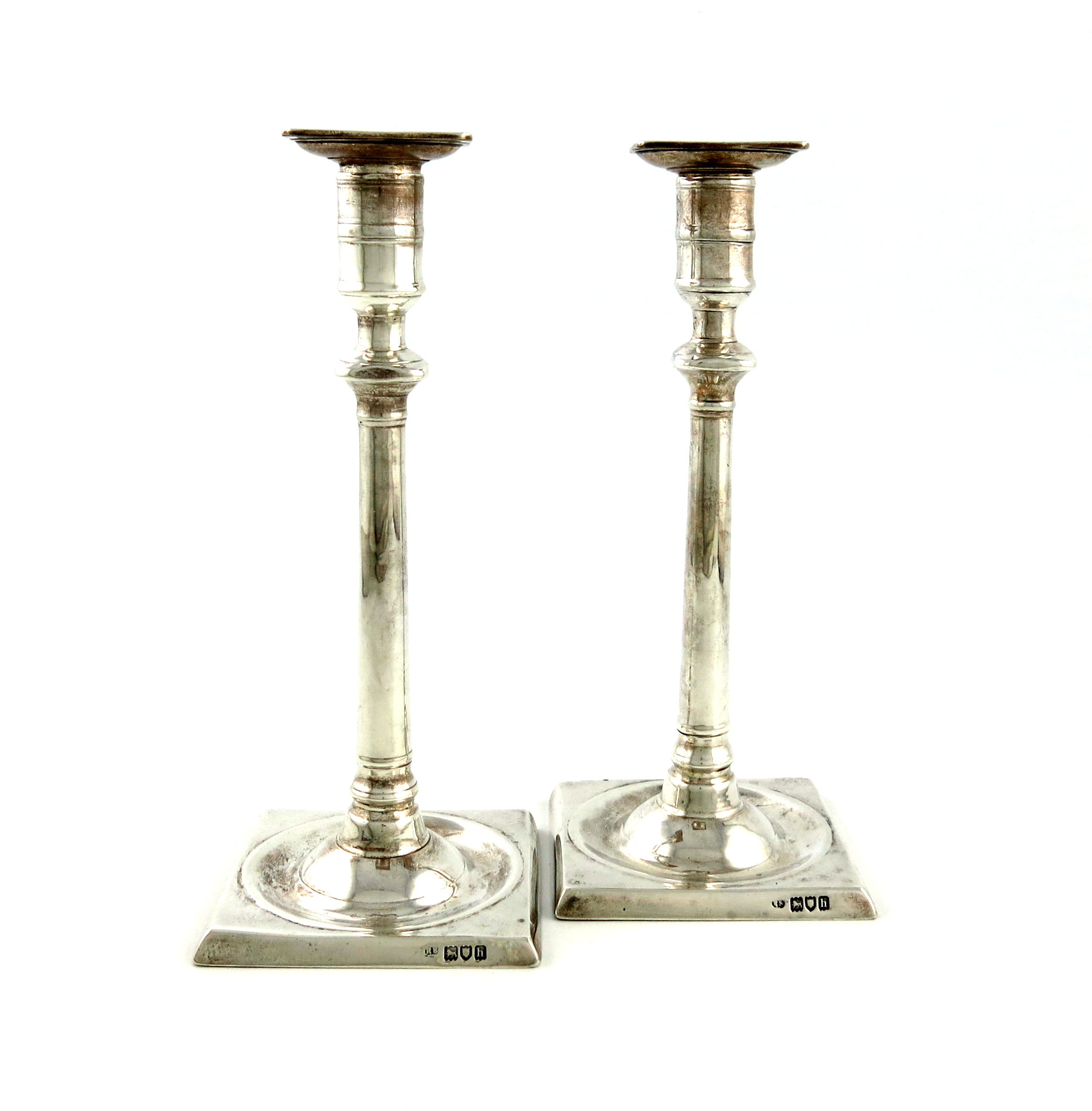 tapering circular columns, spool shaped capitals, detachable drip pans, on square bases, height 22.8cm. approx. weight 25.7cm. (2)
