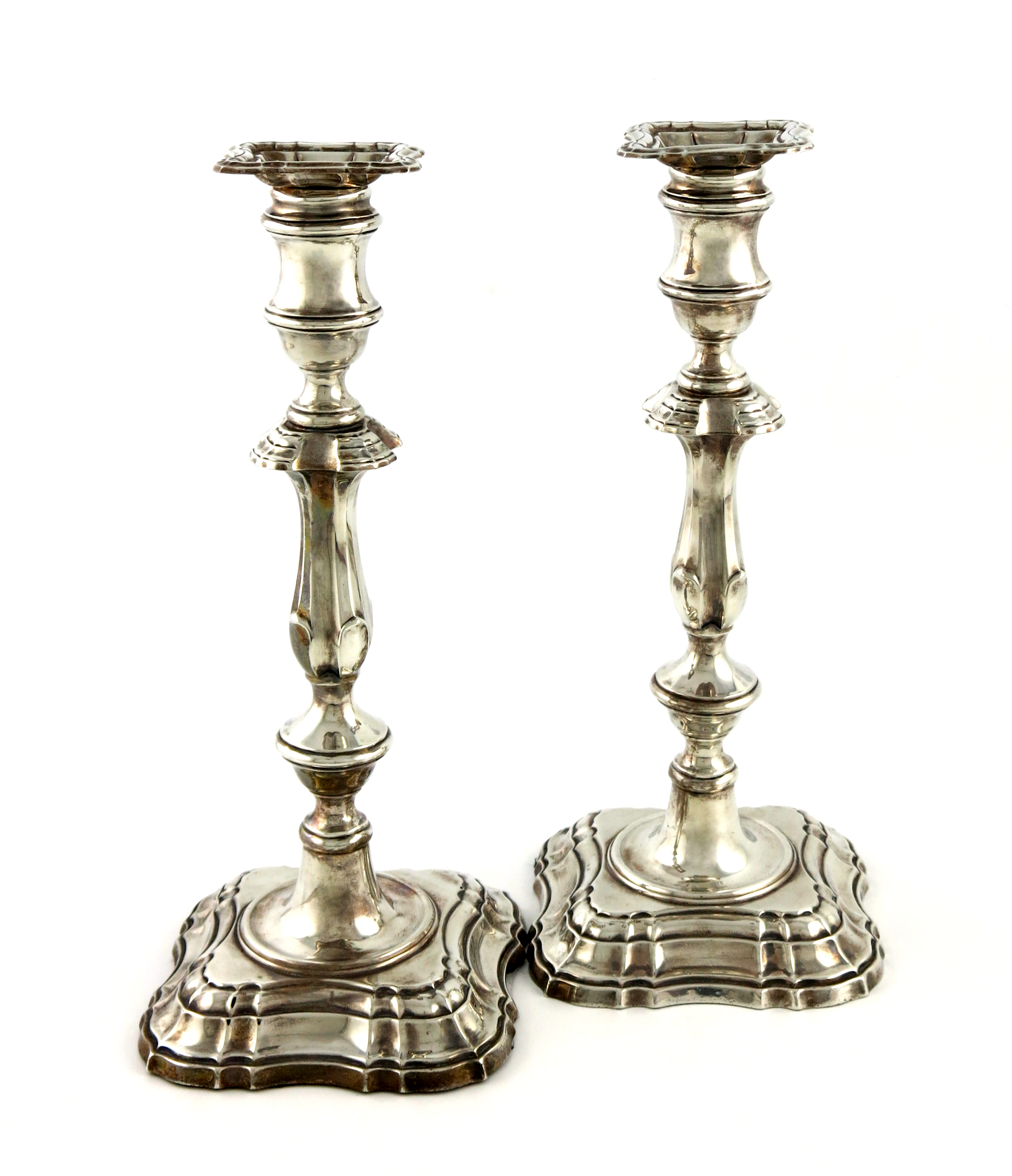 knopped baluster stems, spool shaped capitals, detachable drip pans, on raised shaped square bases, height 30cm. (2)