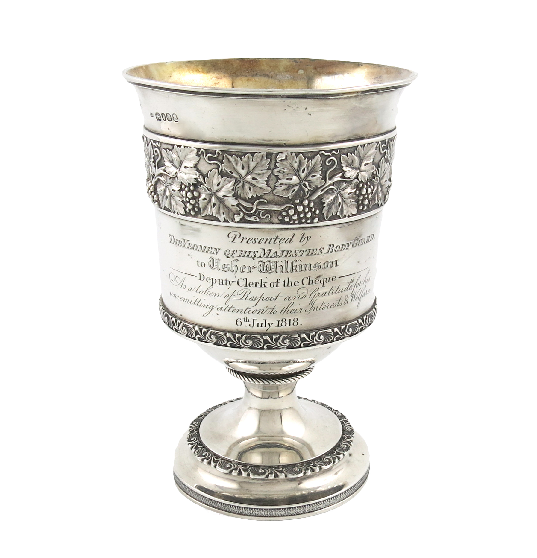 campana form, chased vine leaf border, and with foliate shell borders, inscribed 'Presented by The Yeomen of his Majesties Body Guard, to Usher Wilkinson, Deputy Clerk of the Cheque, as a token of respect and gratitude for his unremitting attention to their interests and welfare, 6 July 1818', height 20.6cm, approx. weight 22.3oz.