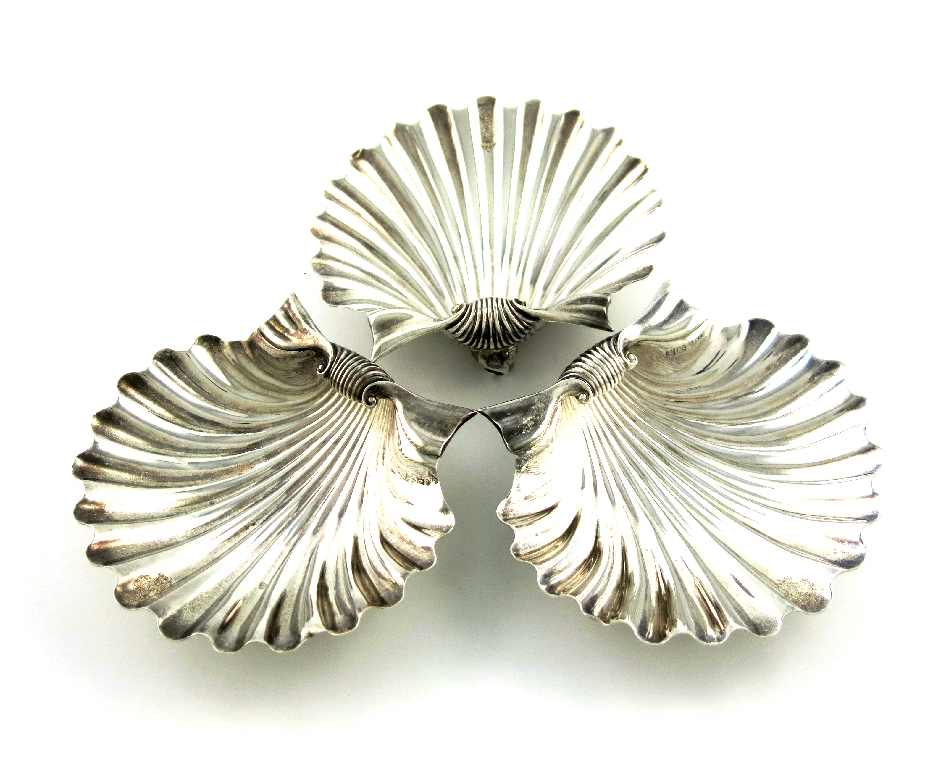 shell form, engraved with a crest, on three scroll shell feet, length 13cm, approx. weight 13oz. (3)