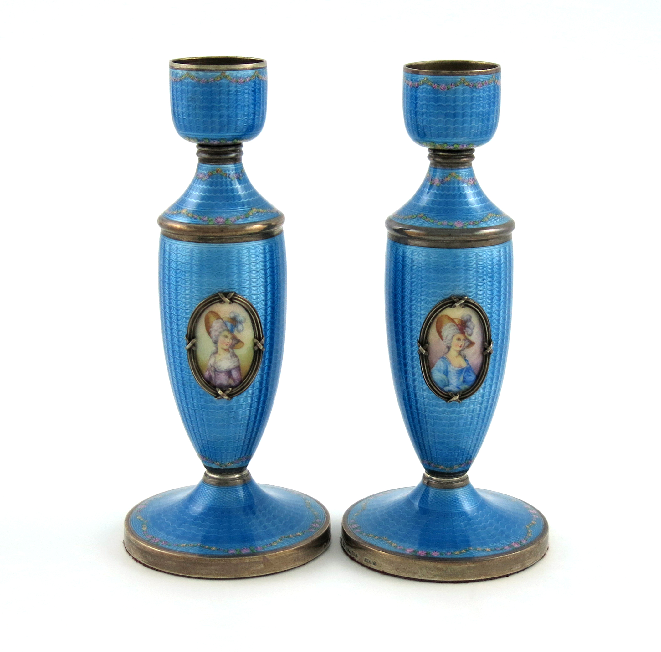 tapering circular form, plain urn capitals with blue enamel decoration, both applied with an enamelled portrait of a lady, on raised circular bases with trailing flower borders, height 13.5cm. (2)