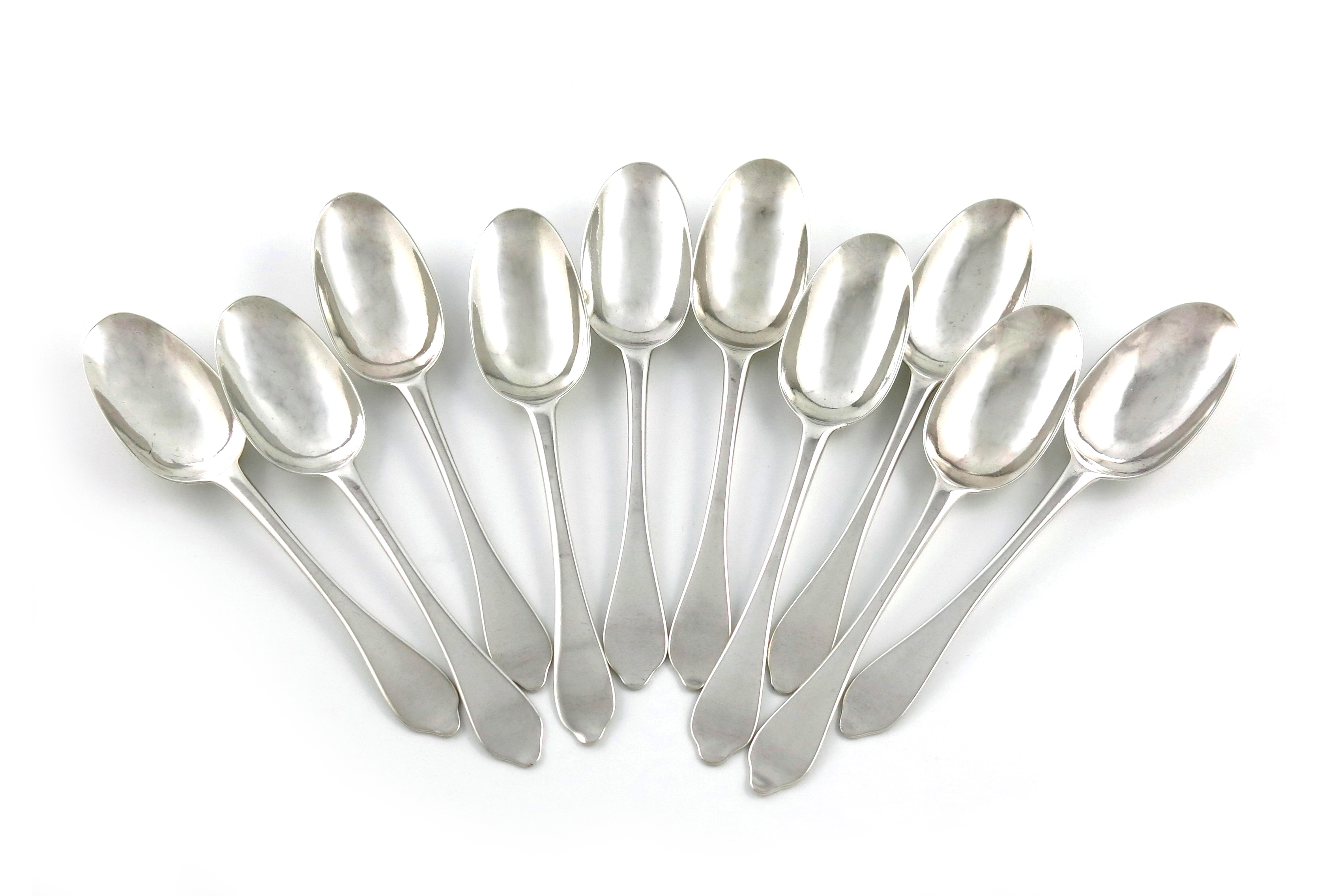 the oval bowl with a plain rat-tail, the reverse of the terminals with an armorial, length 19.7cm, approx. weight 21.2oz. (10)
