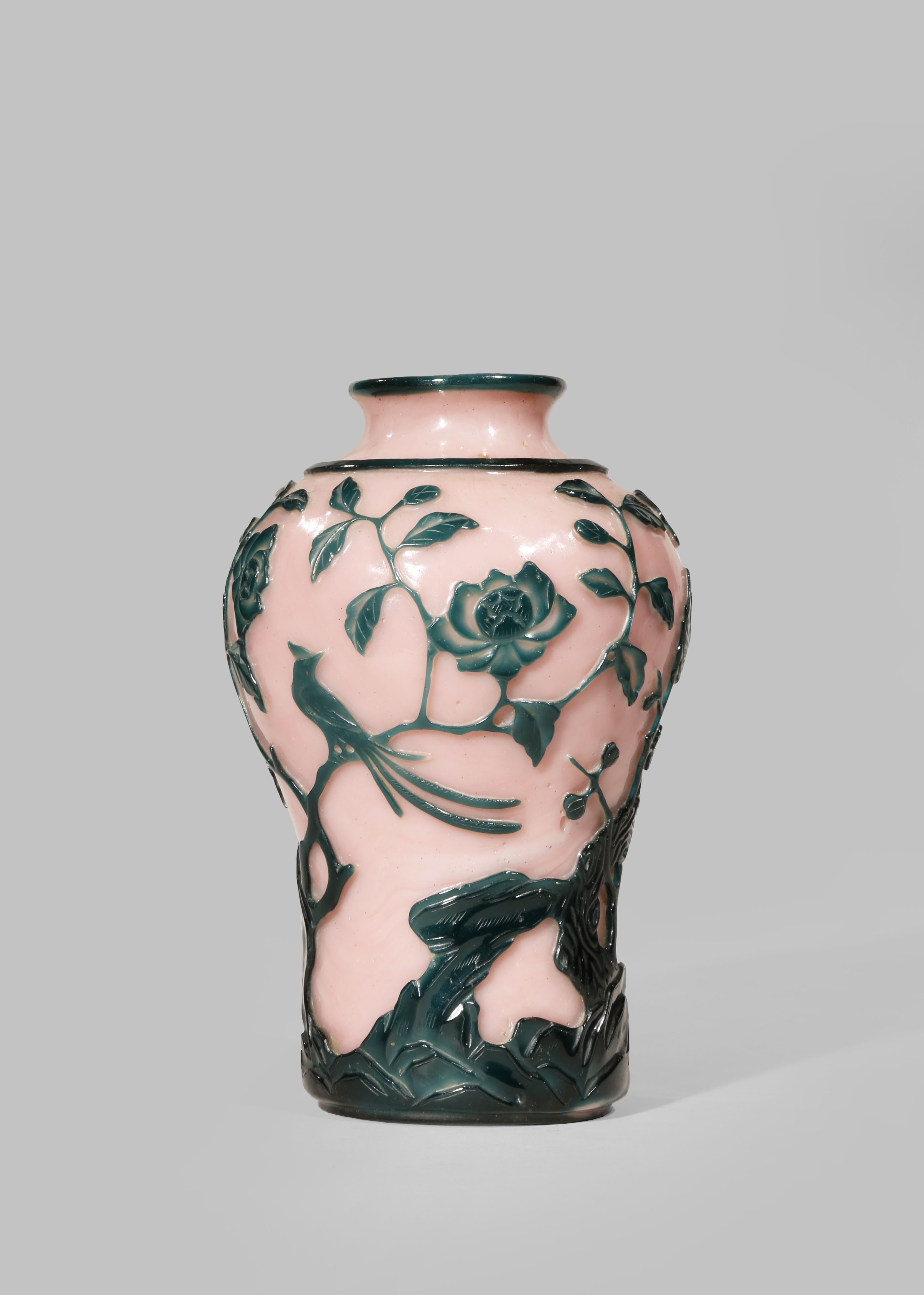A CHINESE BEIJING GLASS PINK AND GREEN OVERLAY VASE 18TH/19TH CENTURY Carved with birds perched...