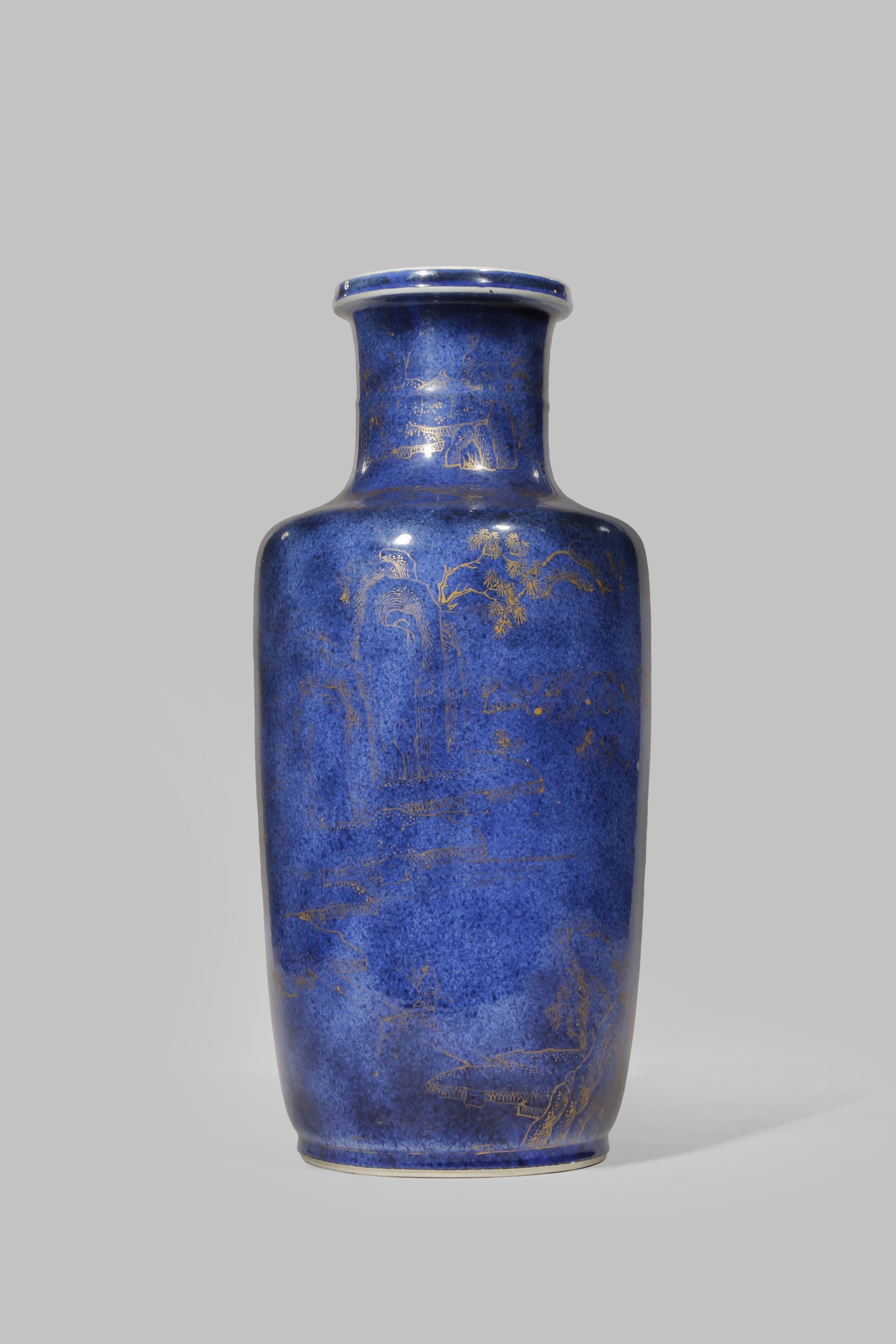 A CHINESE POWDER BLUE-GROUND 'LANDSCAPE' ROULEAU VASE KANGXI 1662-1722 Painted in gilt with a...