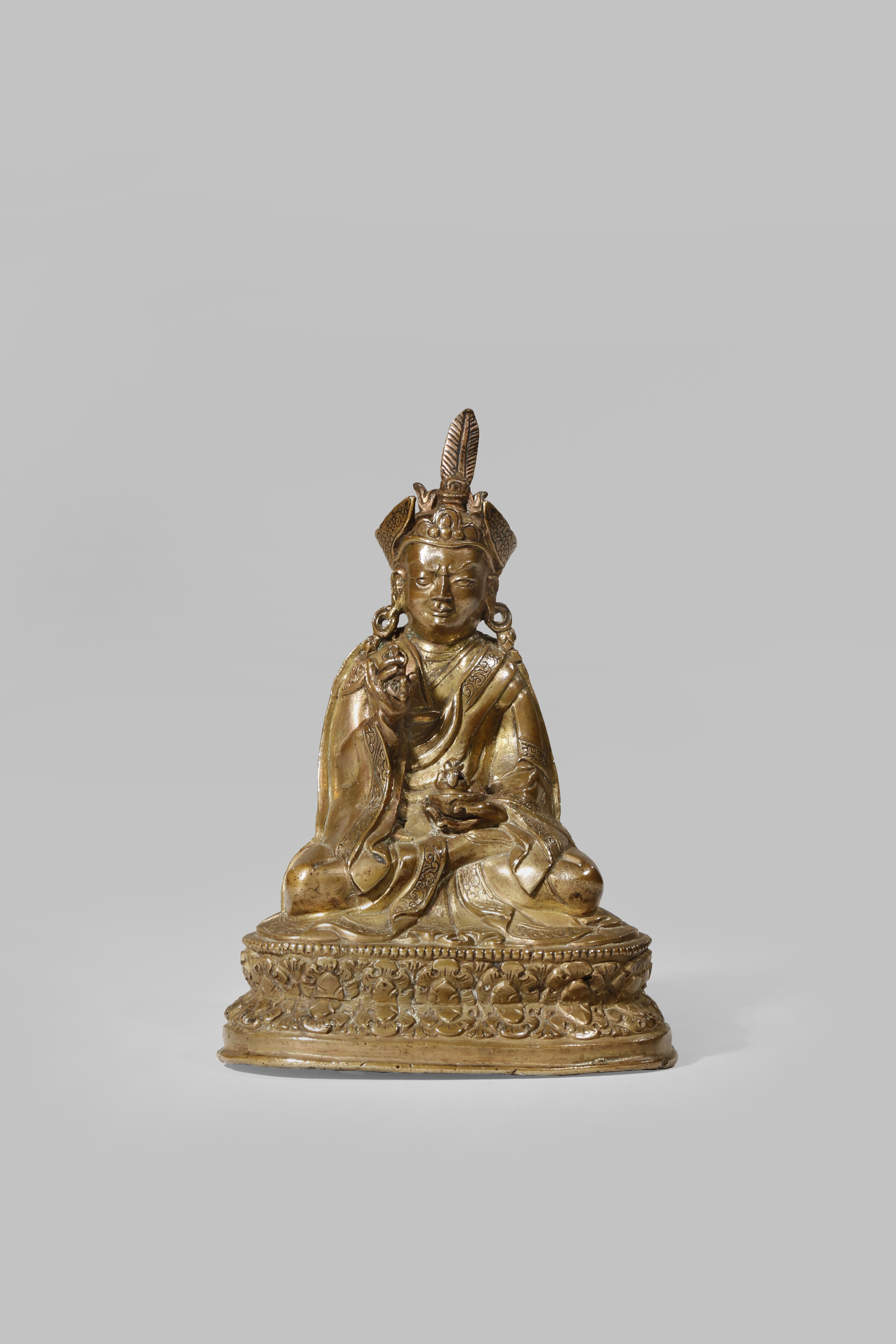Seated with crossed legs on a throne, wearing monk's robes with a finely decorated edge and a cloak, a lotus hat topped with a vulture's feather symbolising the realisation of the highest view, holding a two-pointed vajra in his right hand and a kapala in his left hand, the sealed base with a four-pointed vajra, 13cm, 371g.
