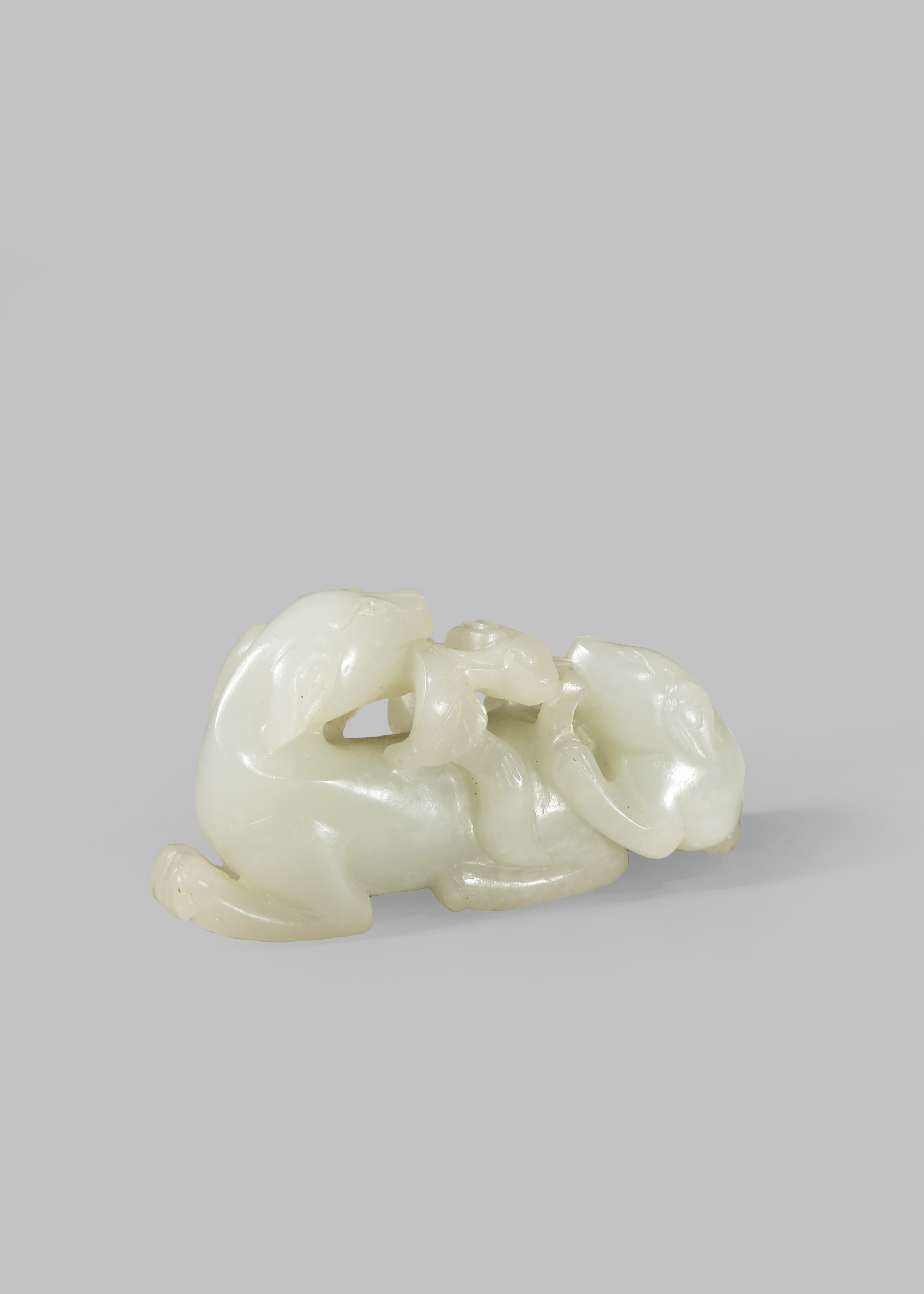 A CHINESE PALE CELADON JADE CARVING OF A DOG AND A PUPPY 19TH CENTURY Reclining