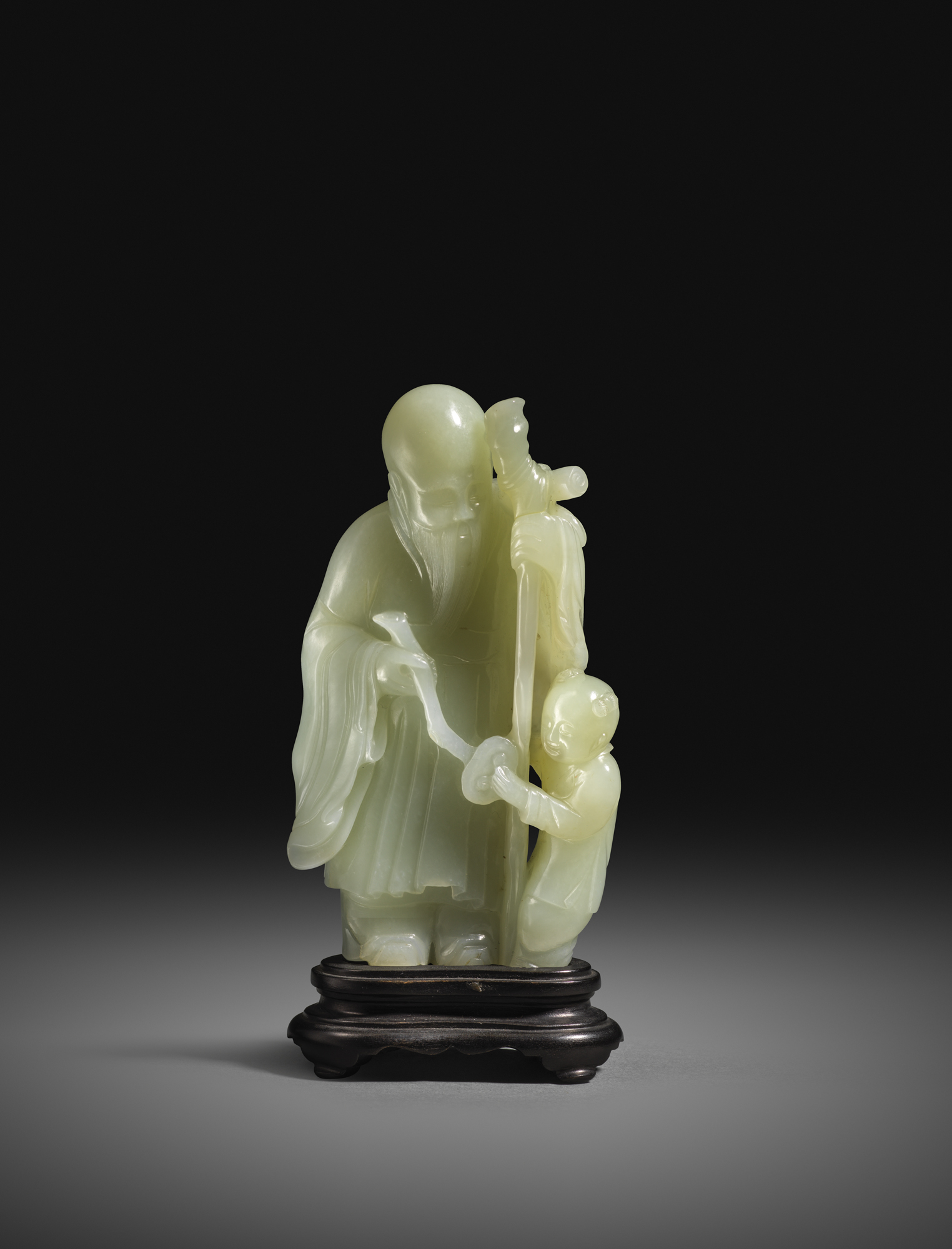 The Immortal stands, leaning on a staff with a scroll tied to its top, holding the long stem of a lingzhi in his right hand, handing it to a small attendant boy, together with a later wood stand, 13cm. (2)