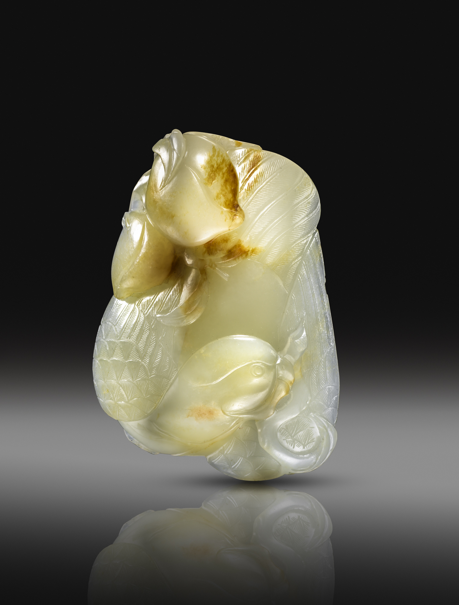 Of flattened form with finely defined feathers, holding a branch with two peaches in its beak, the stone with russet markings, 7cm.