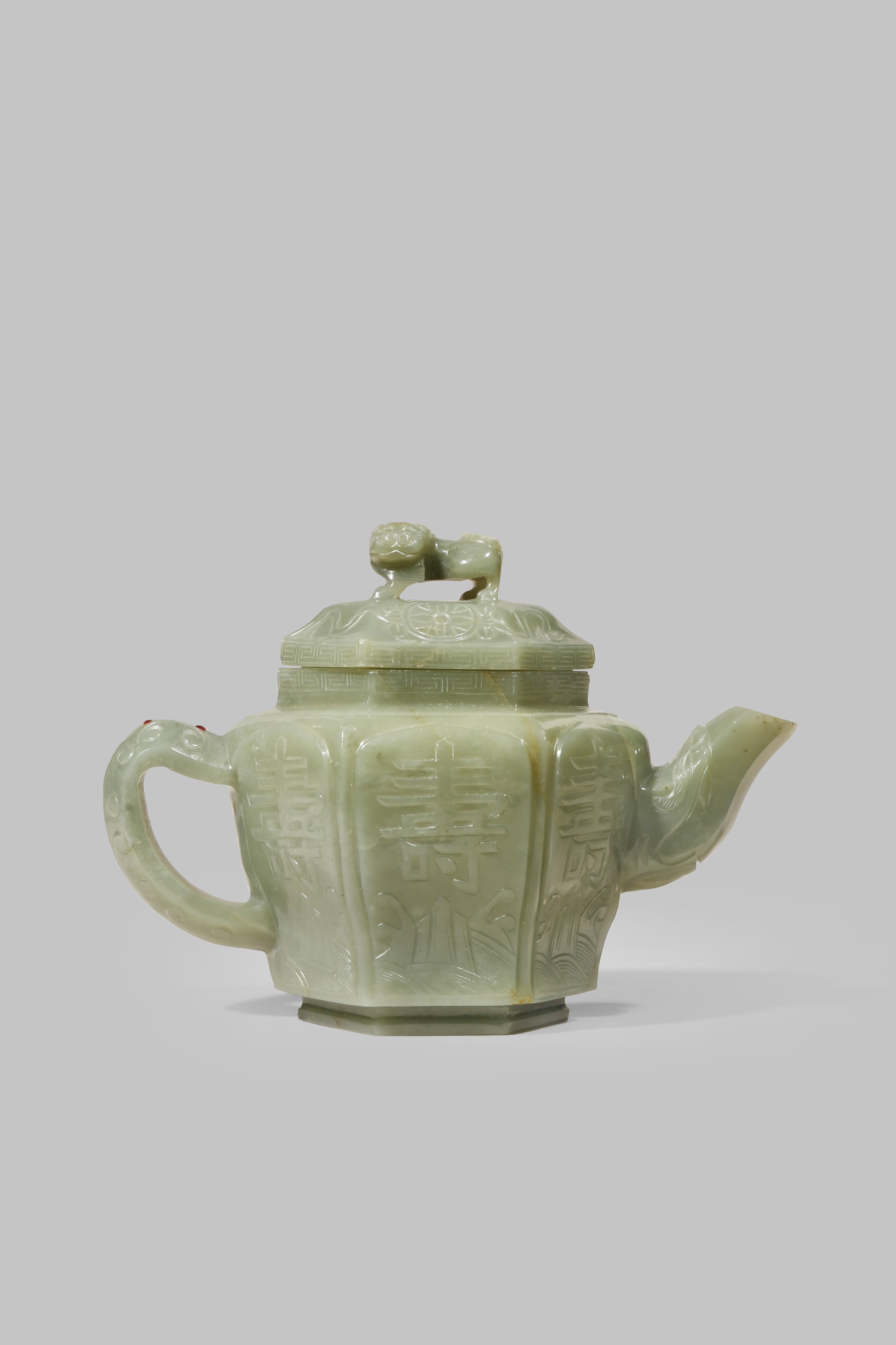 A CHINESE GREY-GREEN JADE TEAPOT AND COVER LATE QING DYNASTY/20TH CENTURY The hexagonal body...