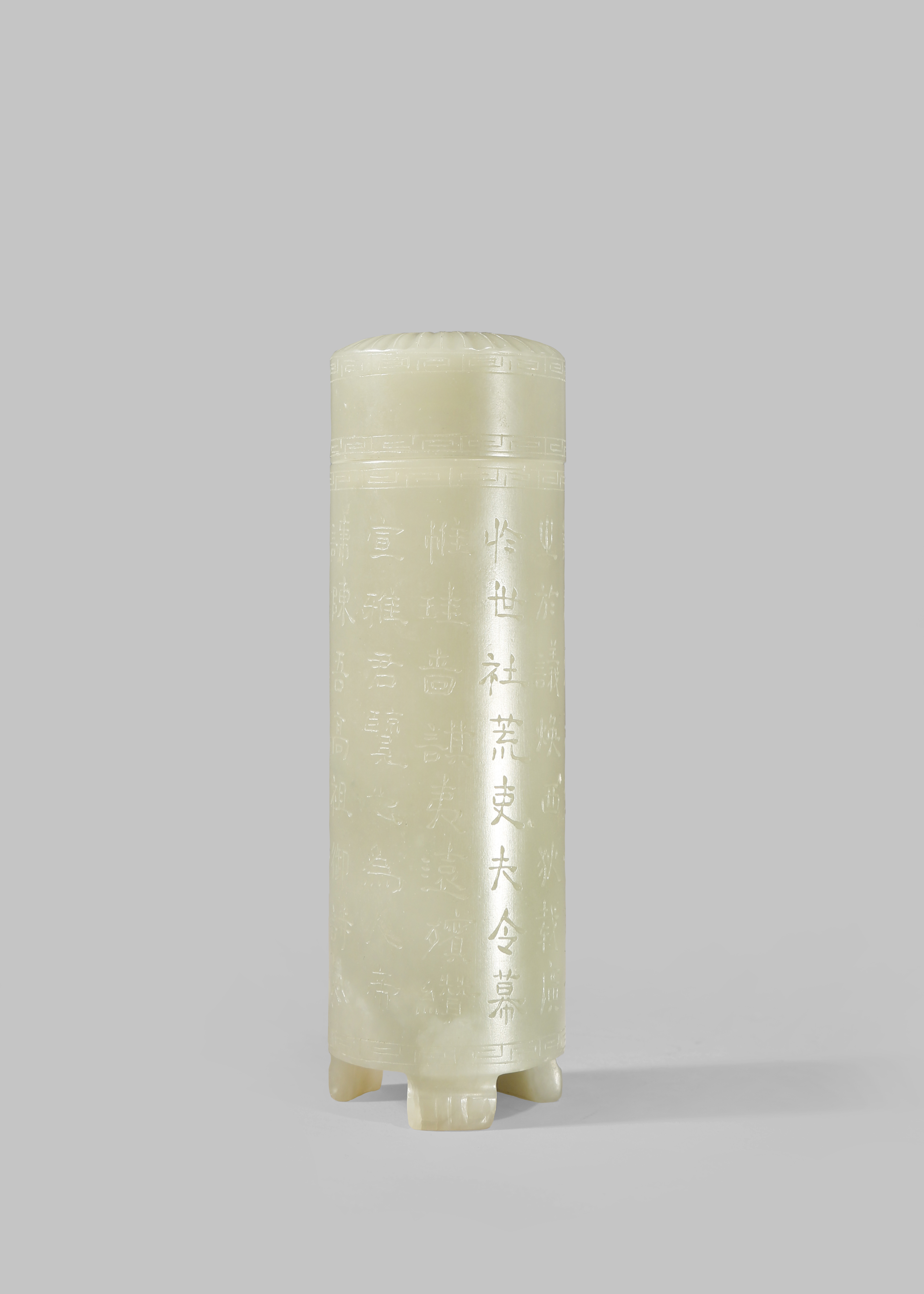 A CHINESE CELADON JADE CYLINDRICAL BOX AND COVER QING DYNASTY Carved with a ten line poem