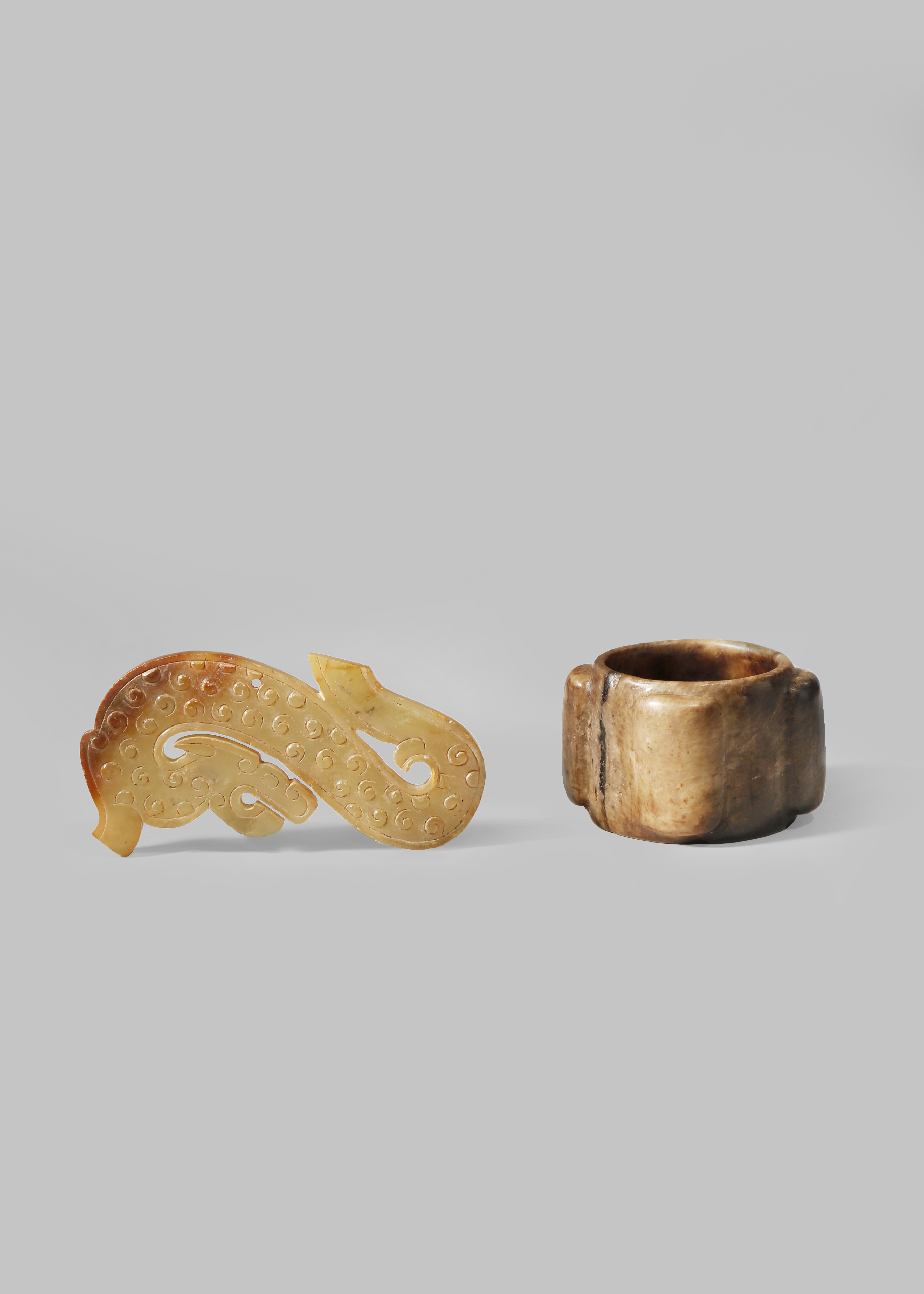 TWO CHINESE ARCHAISTIC JADE CARVINGS MING DYNASTY OR EARLIER One carved from a yellow stone as a...