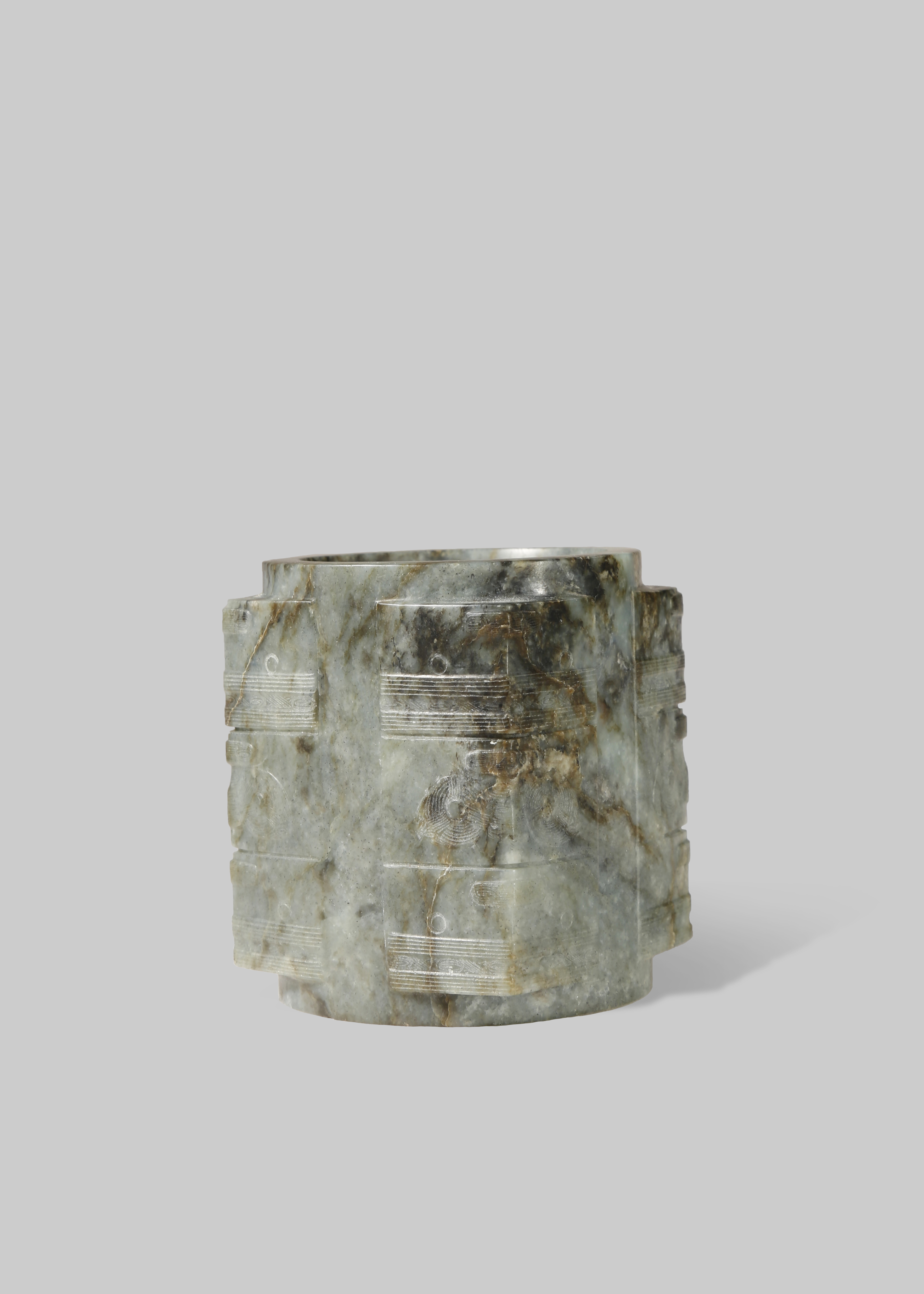 A CHINESE MOTTLED GREY-GREEN JADE ARCHAISTIC CONG