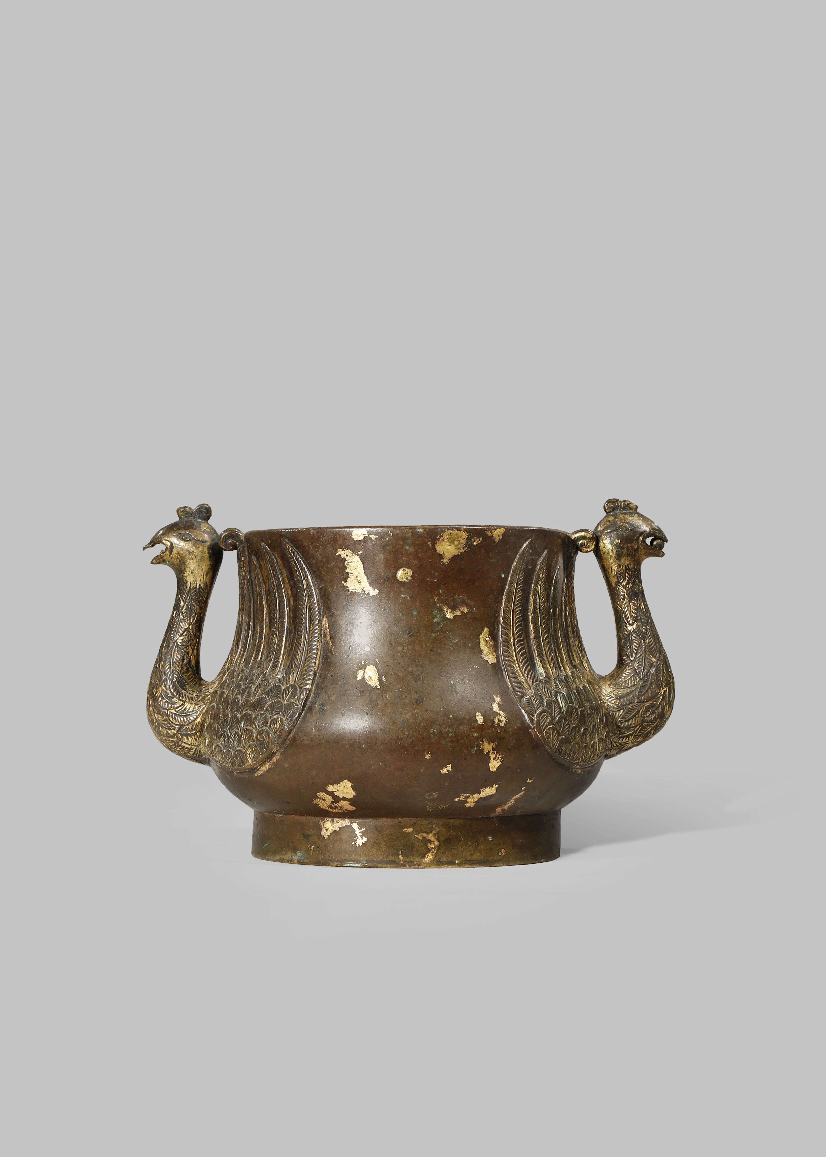 A RARE CHINESE GOLD-SPLASHED BRONZE 'PHOENIX' INCENSE BURNER MING DYNASTY The pear-shaped body...