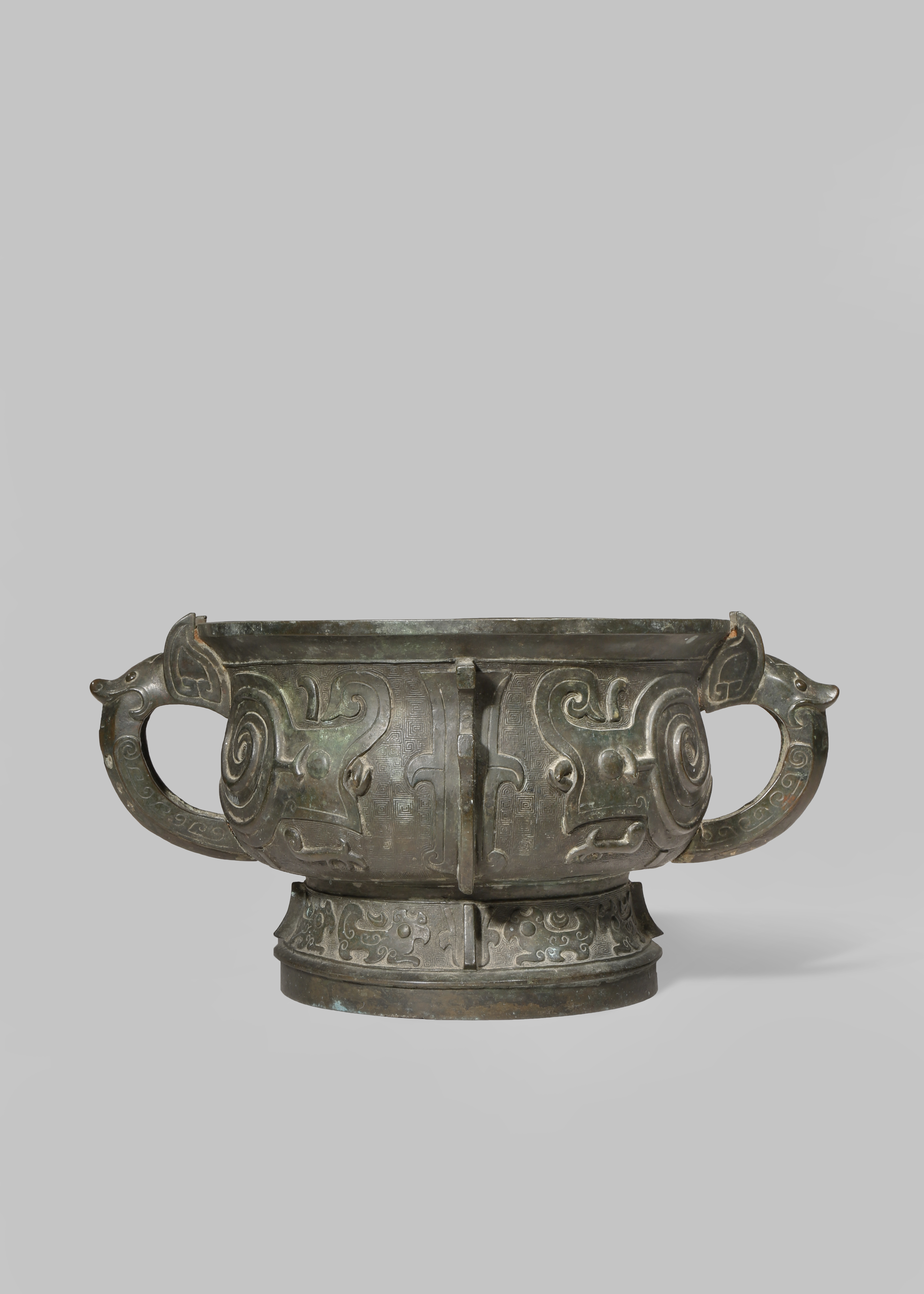 A CHINESE BRONZE ARCHAISTIC FOOD VESSEL GUI QING DYNASTY The bombé-shaped body with two...