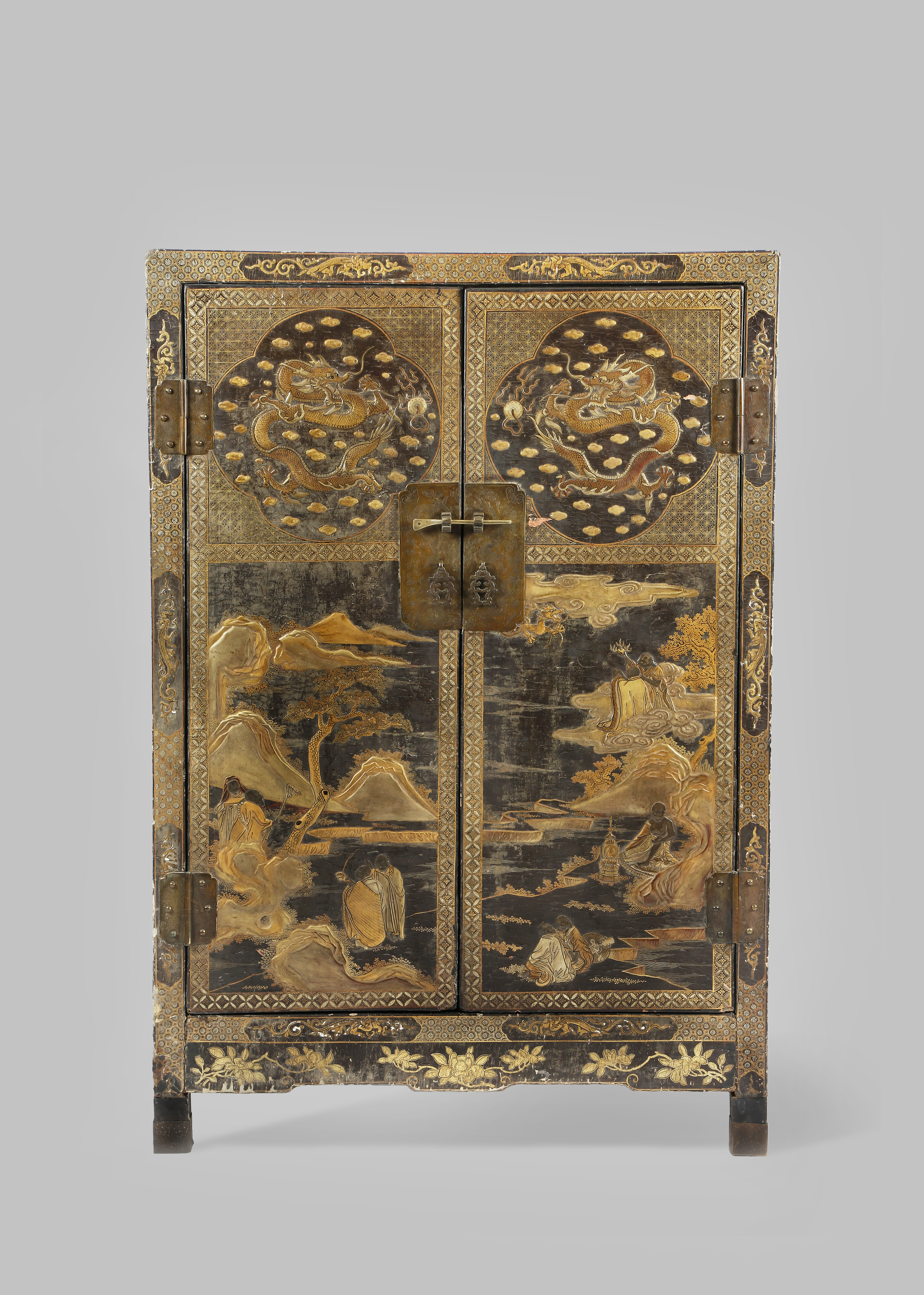 Each with a pair of doors enclosing shelves, decorated in raised gilt with panels of Immortals, mountain landscapes and scaly dragons, the sides with panels of stylised lotus and dragons, 141cm x 96cm x 42cm. (2)