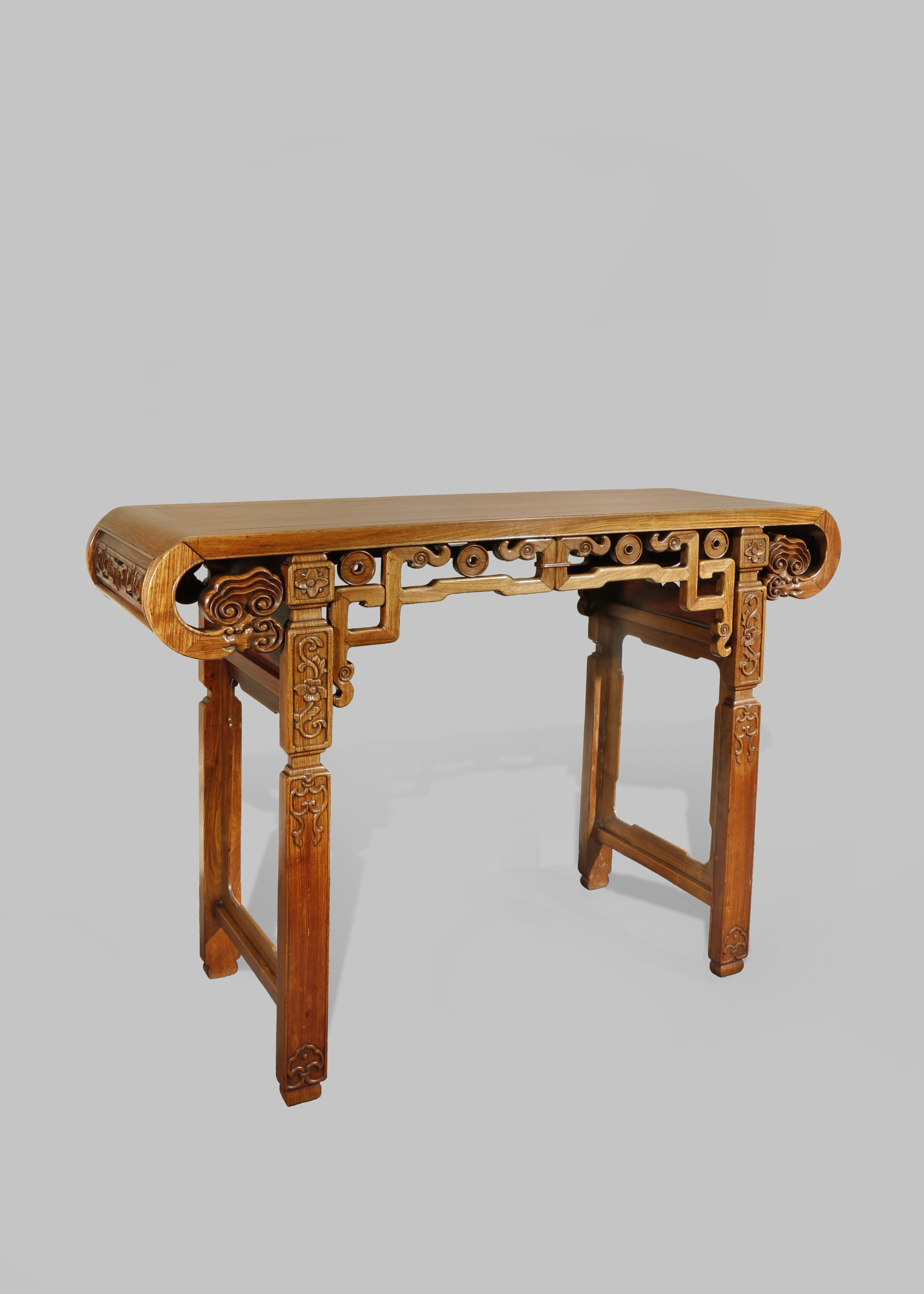 The rectangular top with curved ends carved with lingzhi terminals, the apron carved with formal scrolls and rings, the straight legs carved with flowers and joined by stretchers, 86cm x 102cm x 41cm.