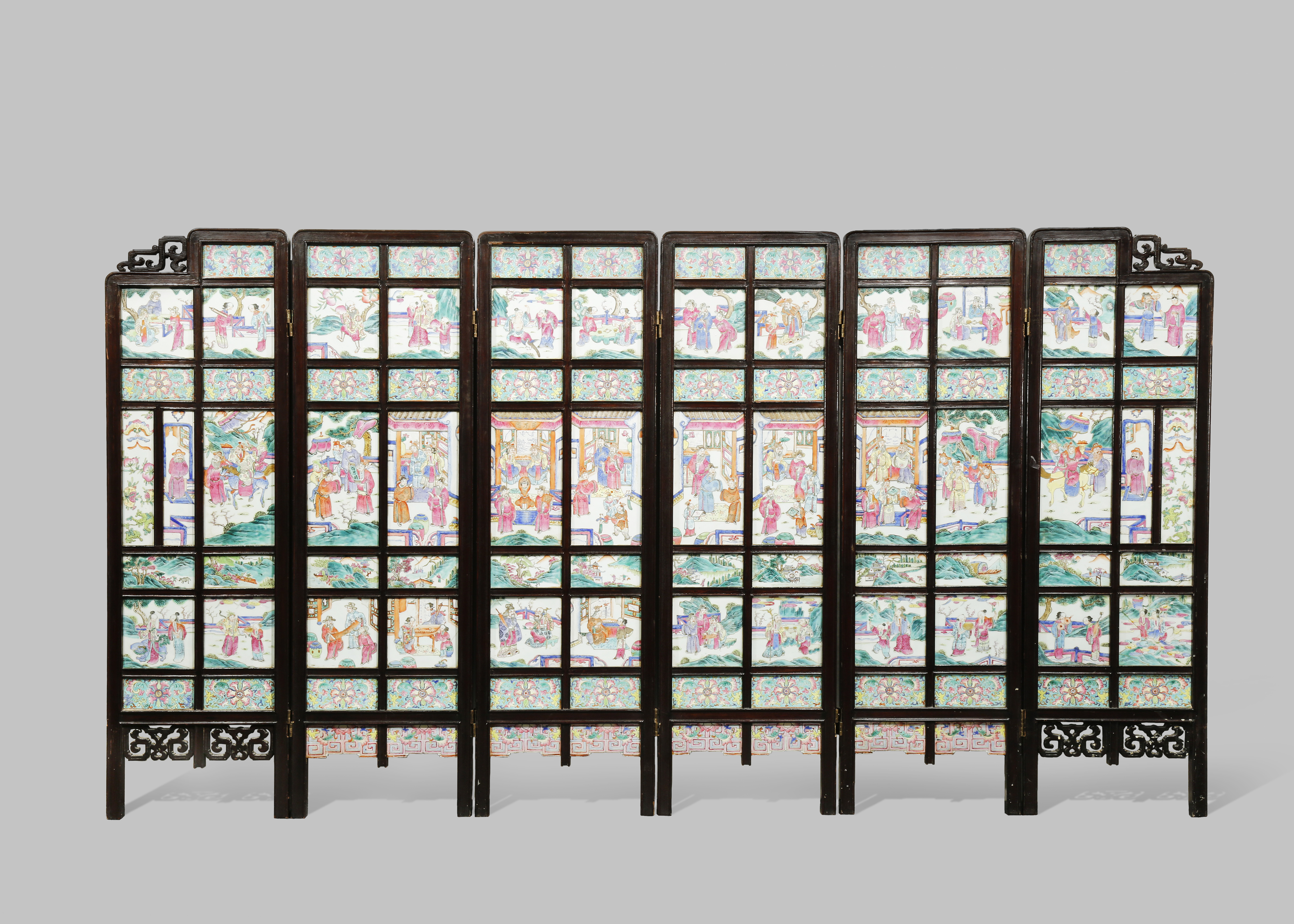 A CHINESE FAMILLE ROSE SIX-FOLD SCREEN 19TH CENTURY The hardwood frame set with panels decorated...