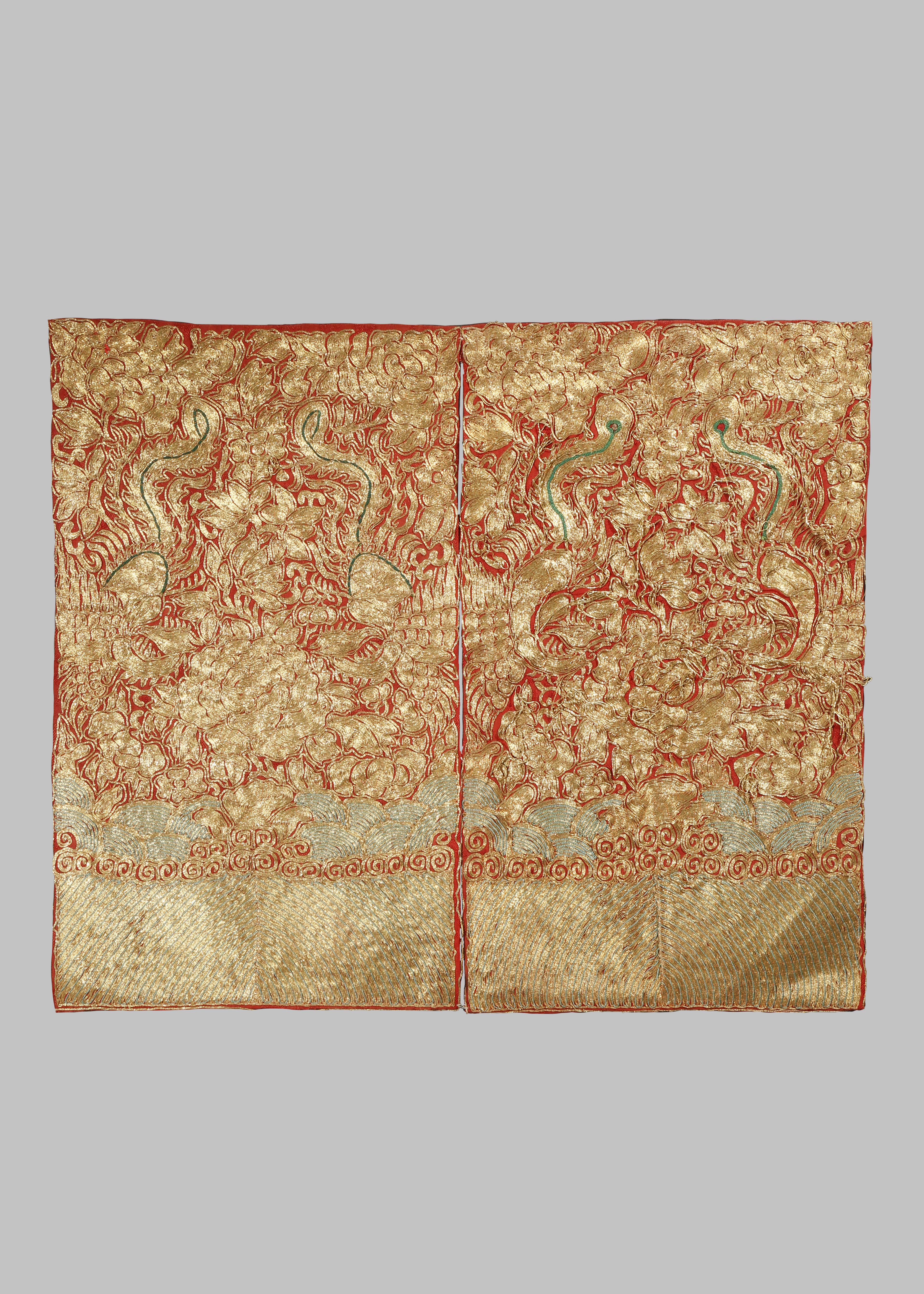 Each embroidered on a pink panel with silk and couched gold thread with pairs of phoenix amidst clouds and peony flowerheads above stylised waves and rocks, 32.5cm x 39cm. (2)