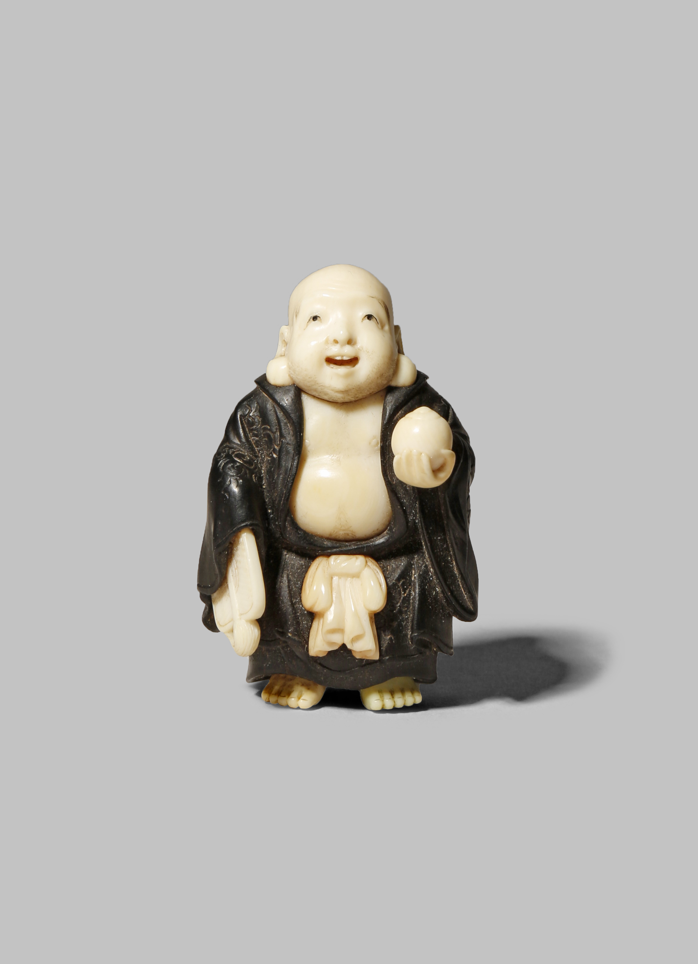 AN UNUSUAL WOOD AND IVORY NETSUKE MEIJI 1868-1912 Depicting Hotei