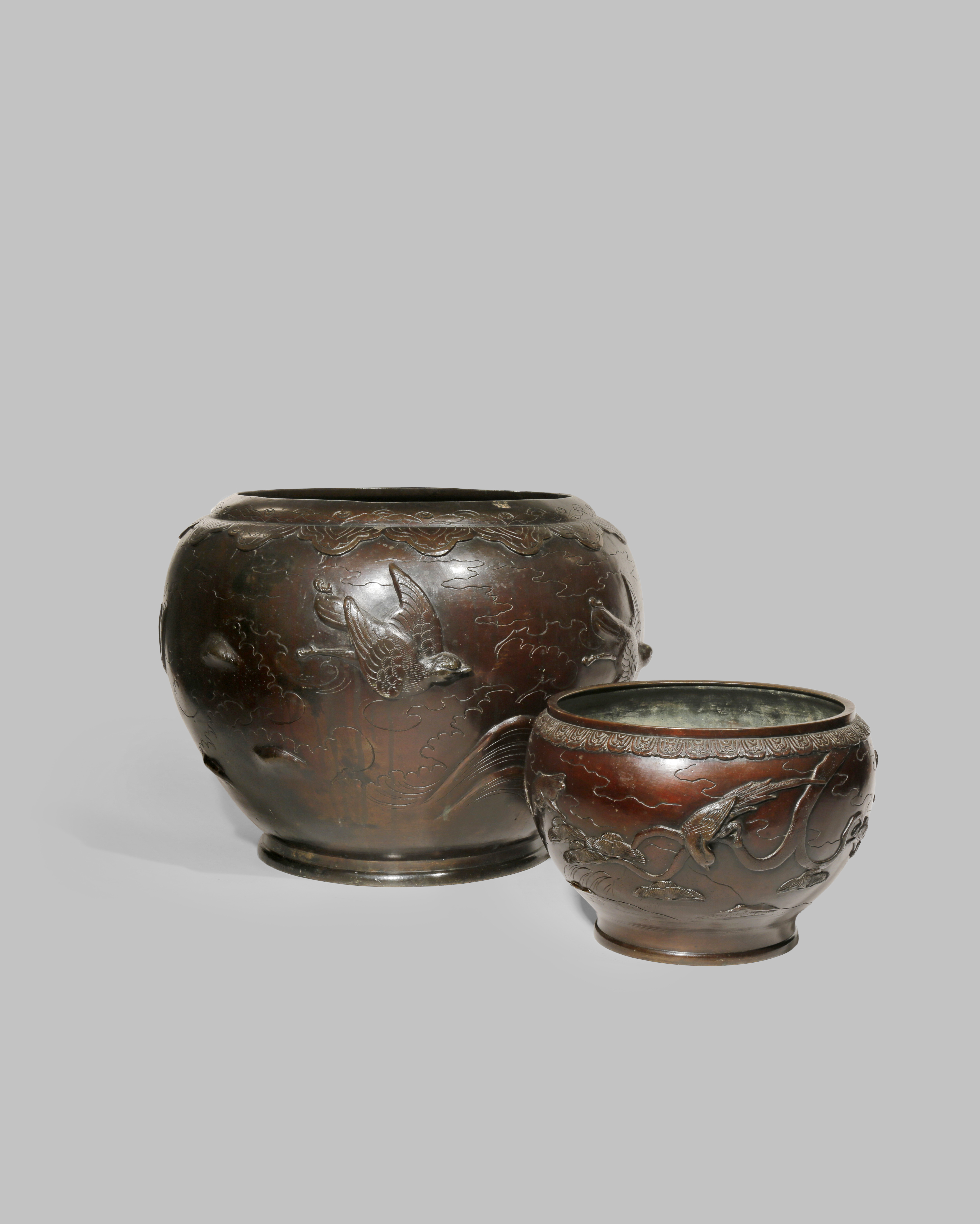 TWO JAPANESE BRONZE JARDINIERES MEIJI 1868-1912 Both with a bulbous body raised on a short foot