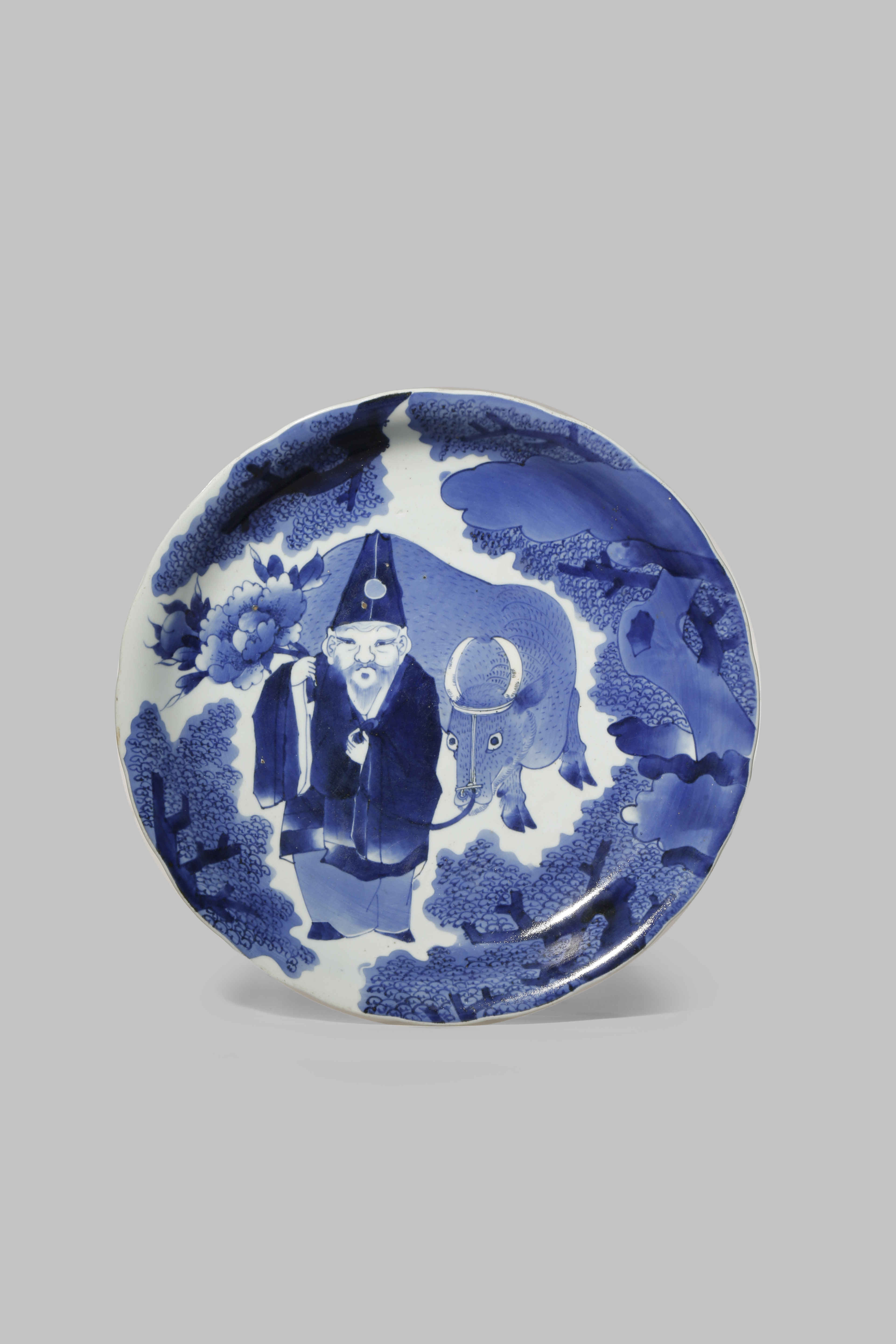 A LARGE JAPANESE ARITA BLUE AND WHITE DISH MEIJI 1868-1912 The lobed body decorated with a sage...