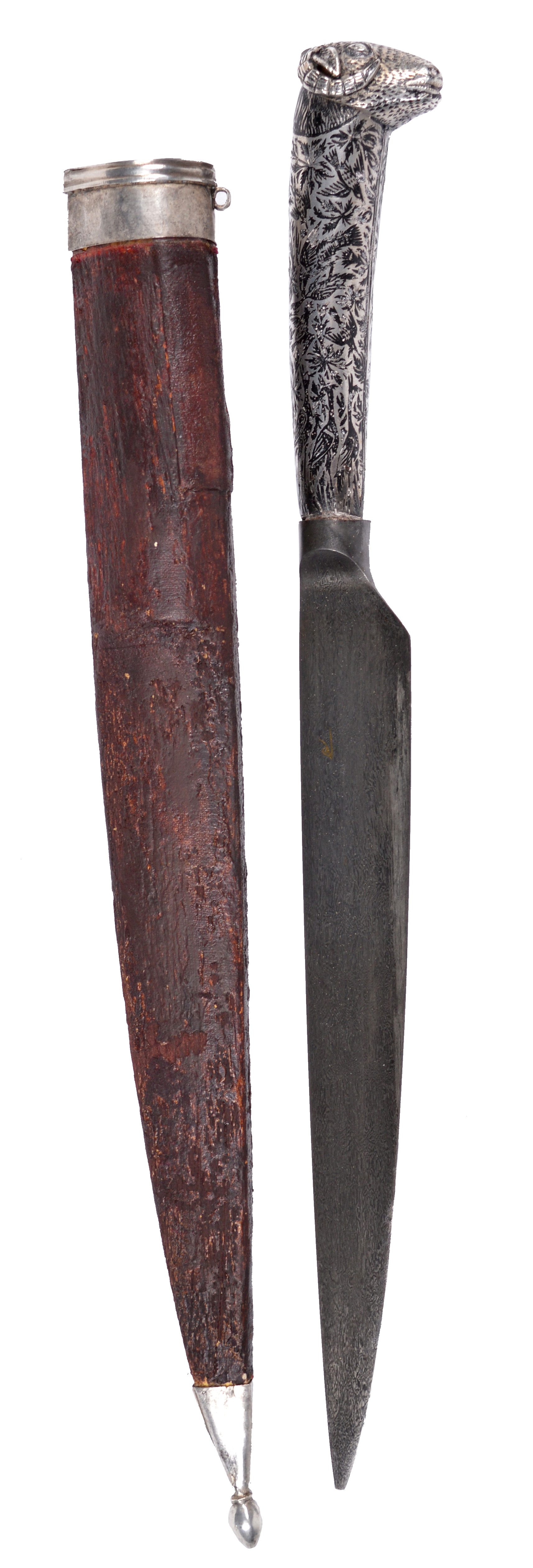 A Persian dagger (kard), watered steel blade 7 in., nielloed hilt with ram's head terminal, white metal mounted scabbard.