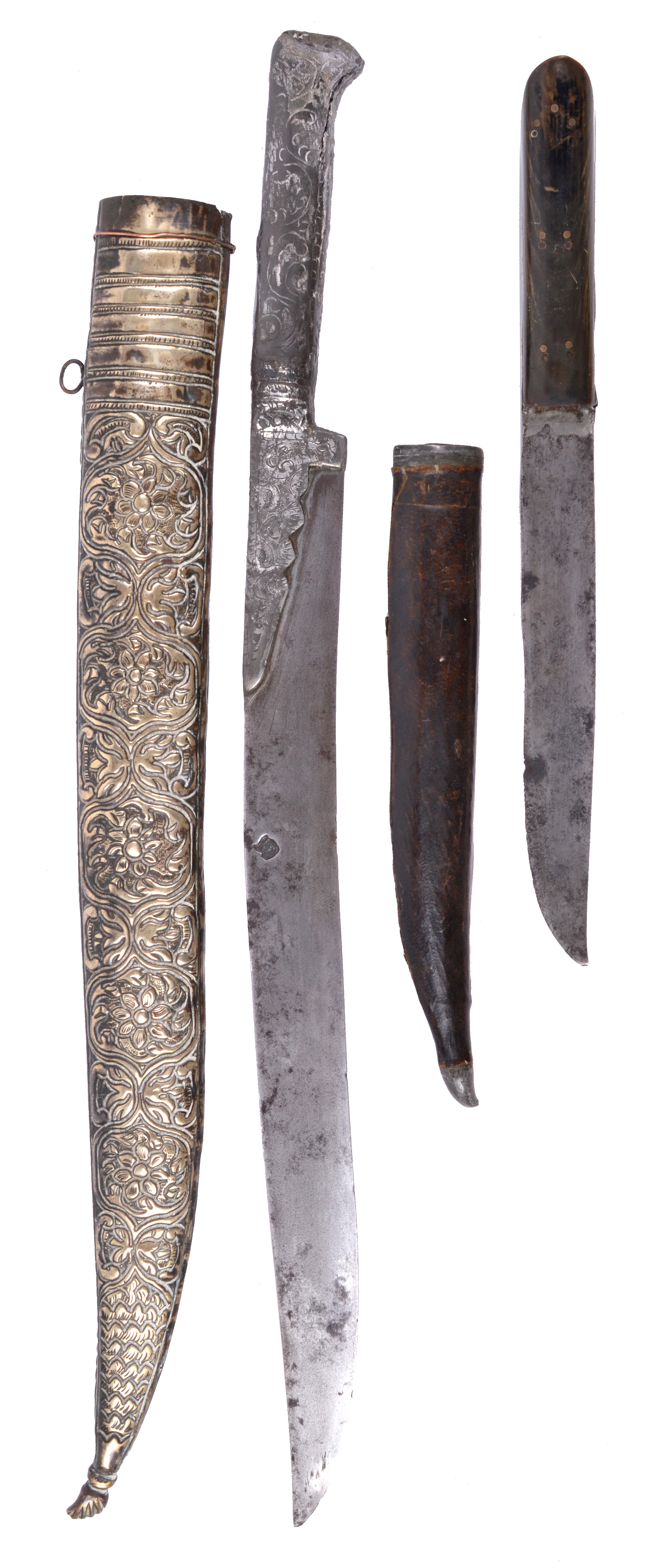 A Turkish Sword (yataghan), forward curving blade 14.25 in. and struck with a foundry mark of zoomorphic form, white metal hilt with engraved foliate decoration, repousse decorated brass covered scabbard; together with a bichaq, hollow ground blade 7 in., characteristic flaring hilt with horn grips and brass covered frame, leather covered scabbard. [2]