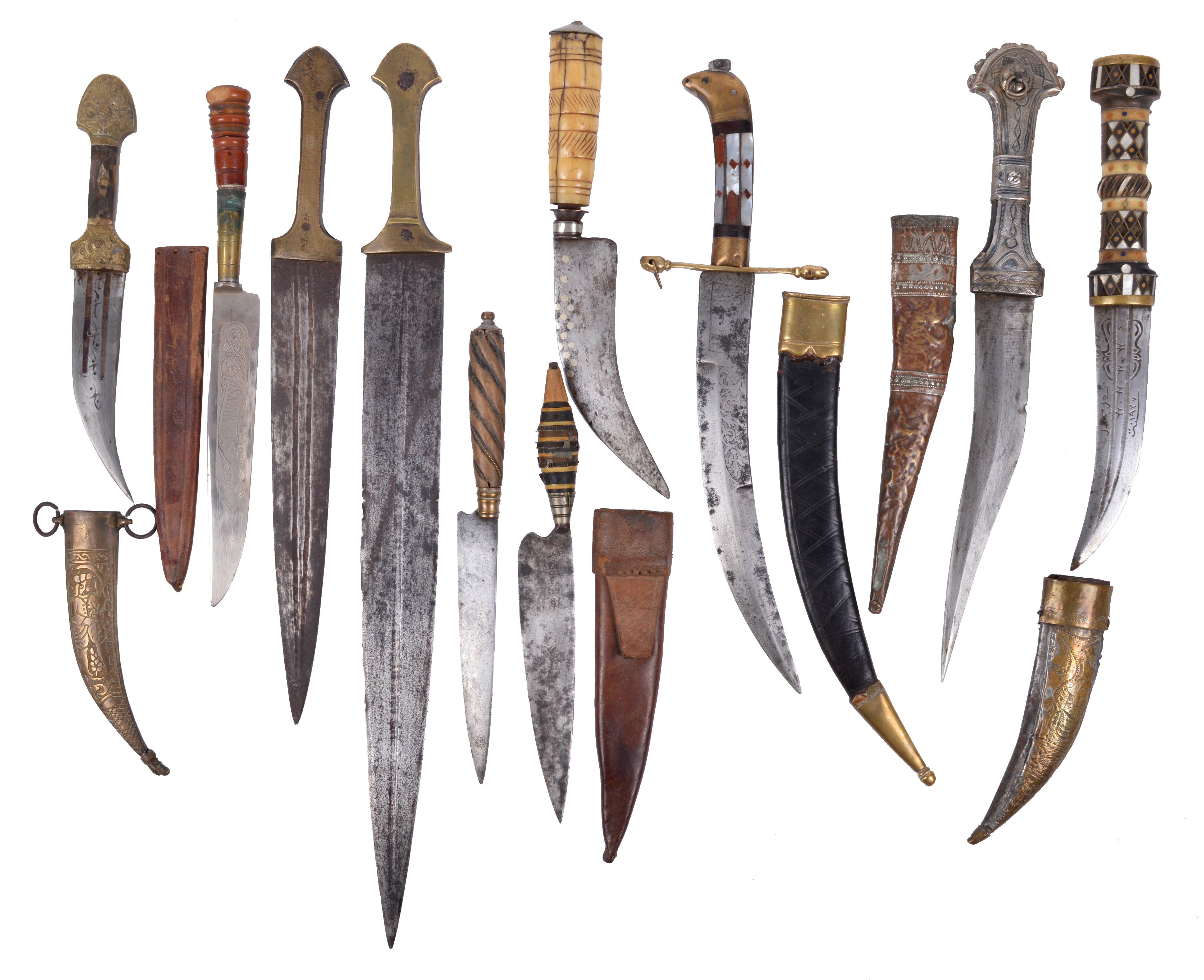 λ A small collection of daggers, including: a Syrian type jambiya, a small kindjal with nielloed hilt, two further of kindjal type with brass hilts, two small knives of Spanish or Corsican type, and other items. [qty]