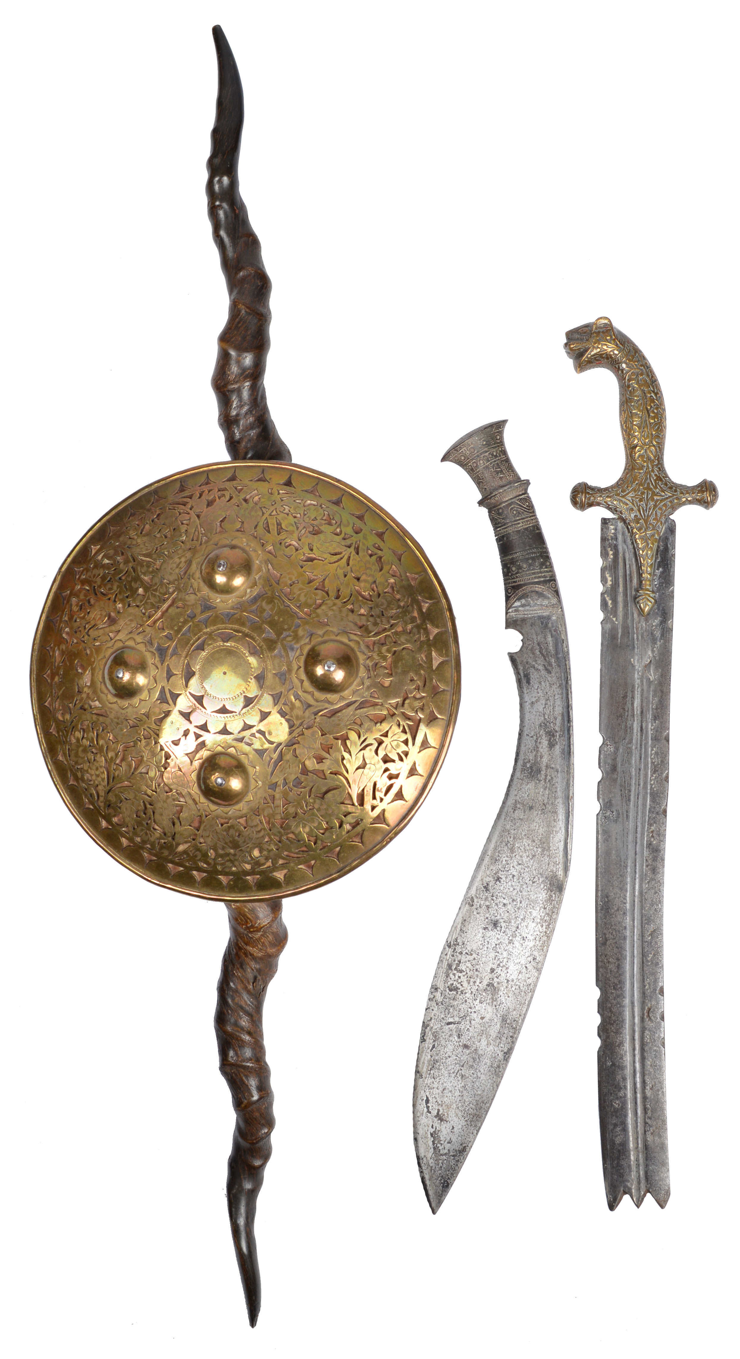 An Indian parrying shield (mahdu), opposed antelope horns fixed at the back of a small shield faced with brass fretwork; together with a good tulwar hilt, of brass with a tiger head pommel and relief foliate decoration, fitted with a shortened blade with later decorative notches; and a kukri, engraved steel hilt. [3]