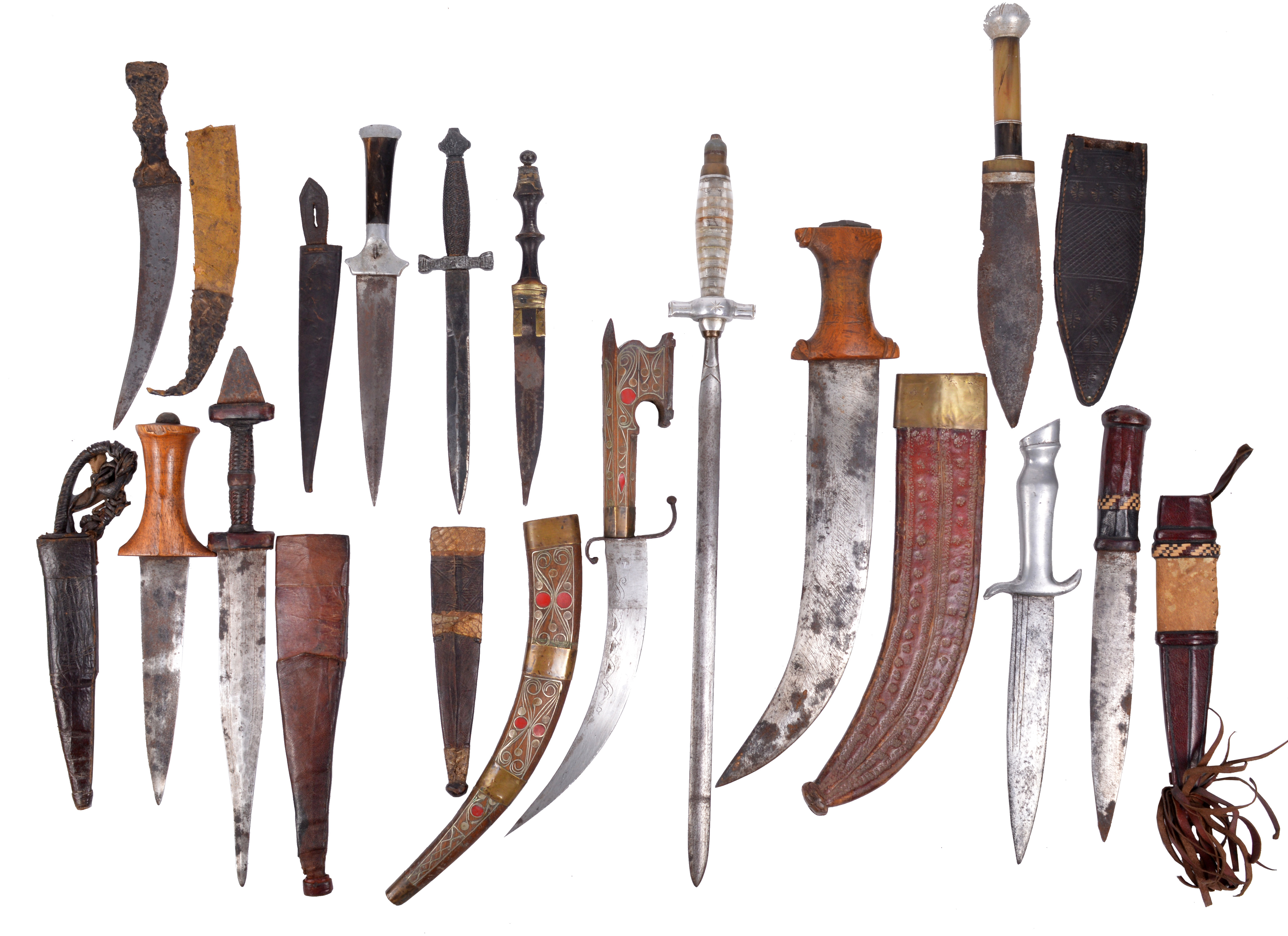 A small collection of knives and daggers, including: an African dagger, the hilt of nimcha form, wooden hilt and scabbard inlaid with coral and brass wire; various African nomadic daggers with hide hilt and scabbard coverings; an unusual hunting knife with aluminium hilt having a horse hoof terminal; a hand made dagger with long slender blade and a segmented perspex grip to the aluminium and brass hilt, and other items. [qty]