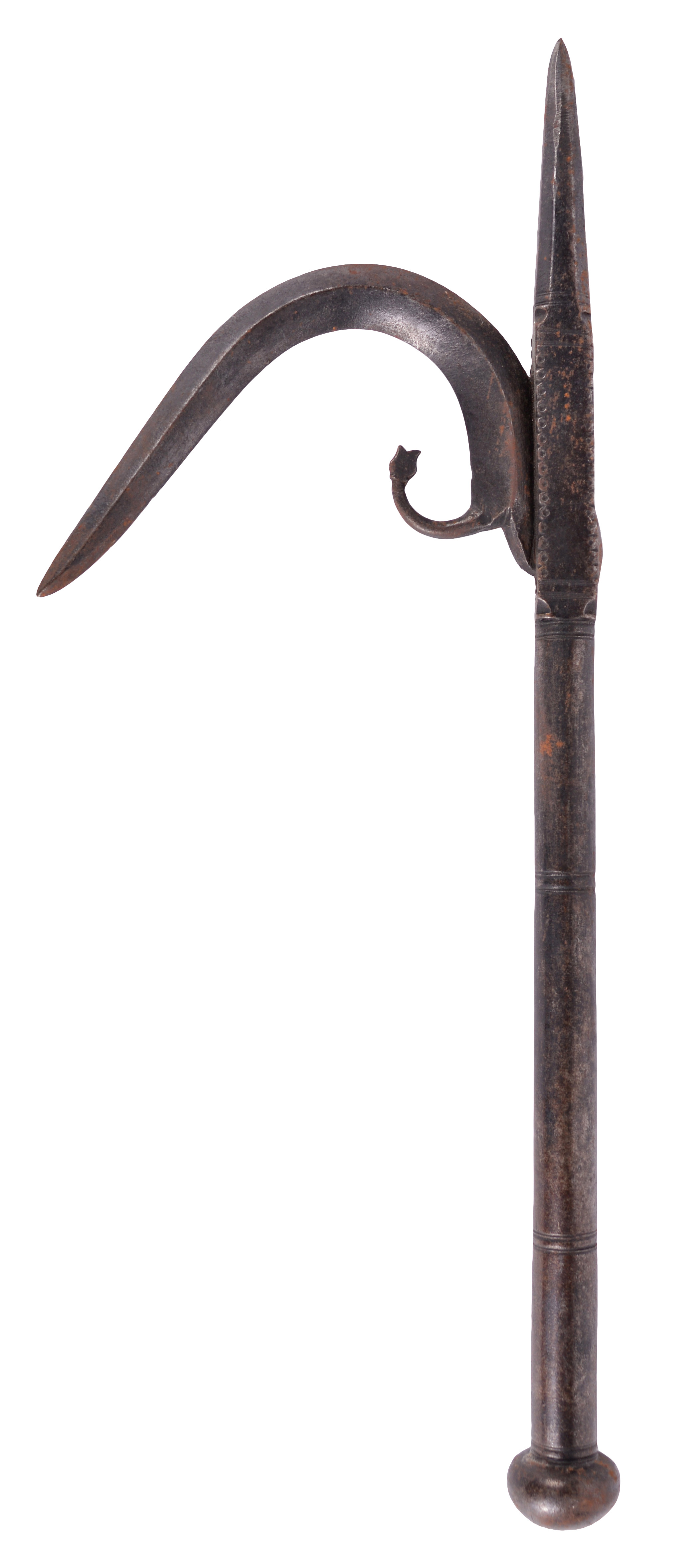 An Indian elephant goad (ancus), heavy all steel construction, haft 18 in. with faceted top spike, square section at the junction with the hook and here having decorative punched borders, stepped down to the round section grip, domed butt; slightly re-curving diamond-section hook with small inner spur terminating in a rudimentary beast's head, tang passing through the haft and hammered over into a rectangle, probably pre-19th Century.