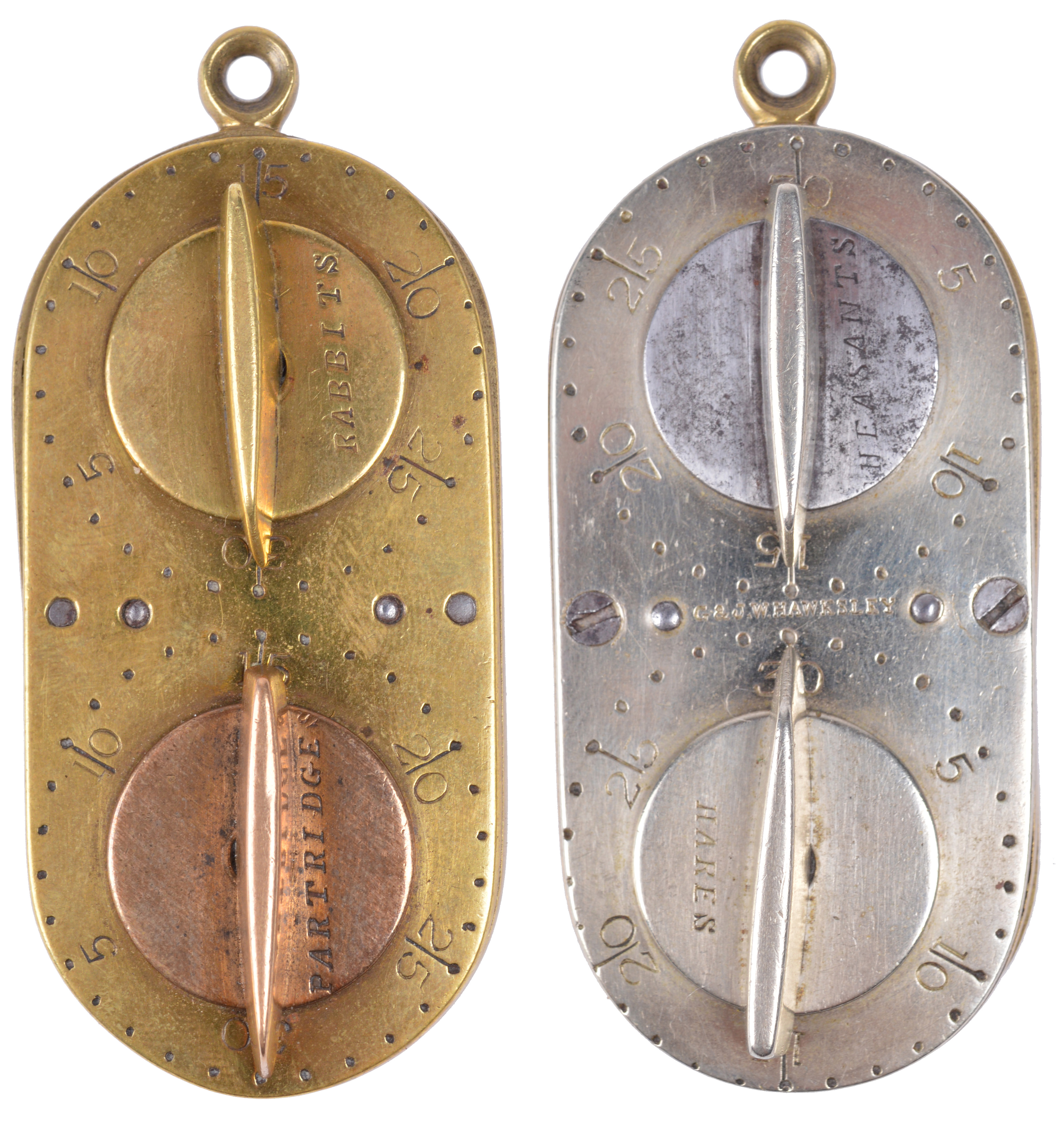 A vintage game counter by G&J. W. Hawksley, of oval form with colour coded dials in white metal (Hares), brass (Rabbits), copper (Partridges) and steel (Pheasants).
