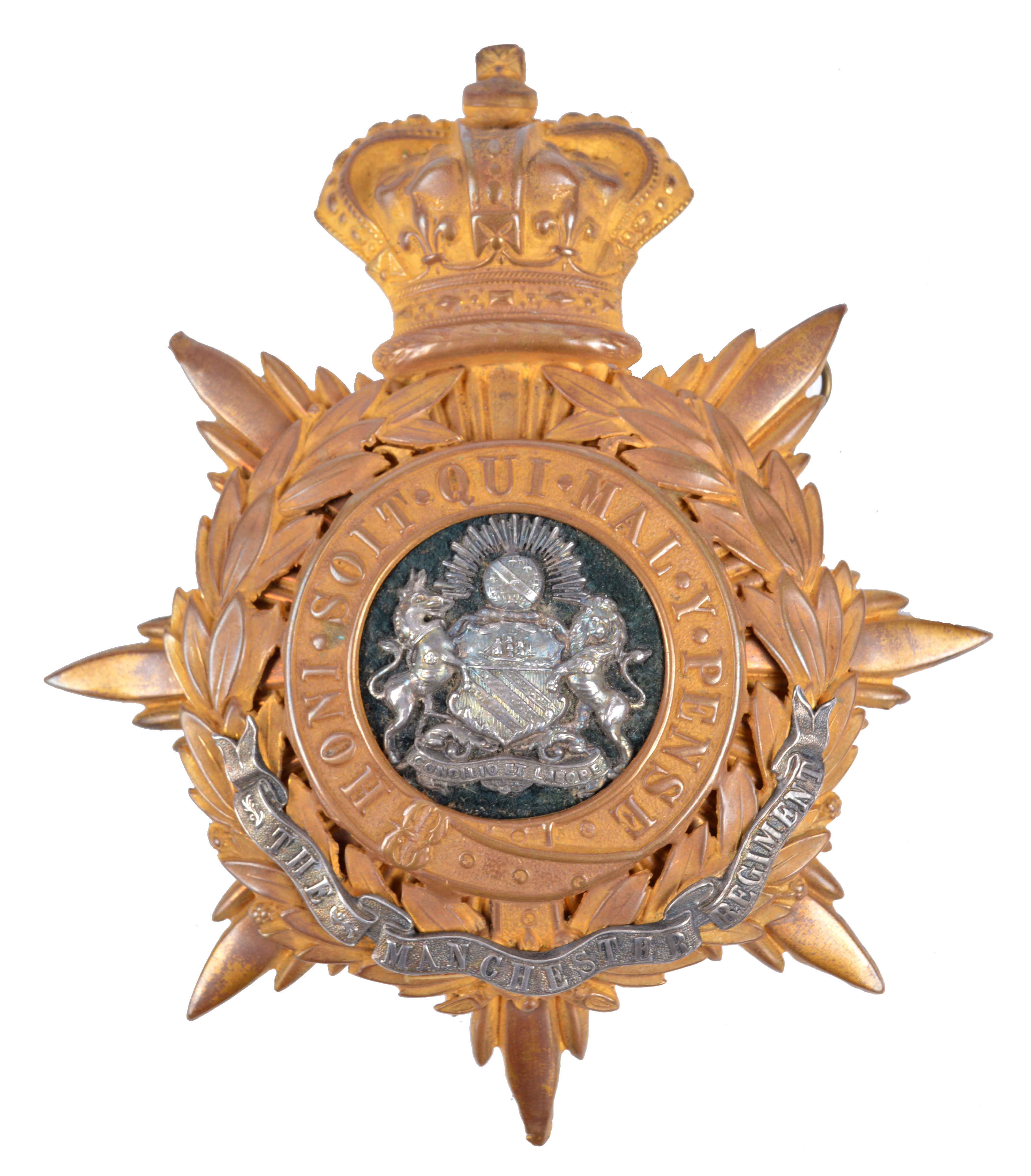 The Manchester Regiment: an officer's helmet plate, 1881-1901, gilt brass plate with Queen's crown, centre with city arms in silver to a black velvet ground, 'THE MANCHESTER REGIMENT' to the the silver scroll.