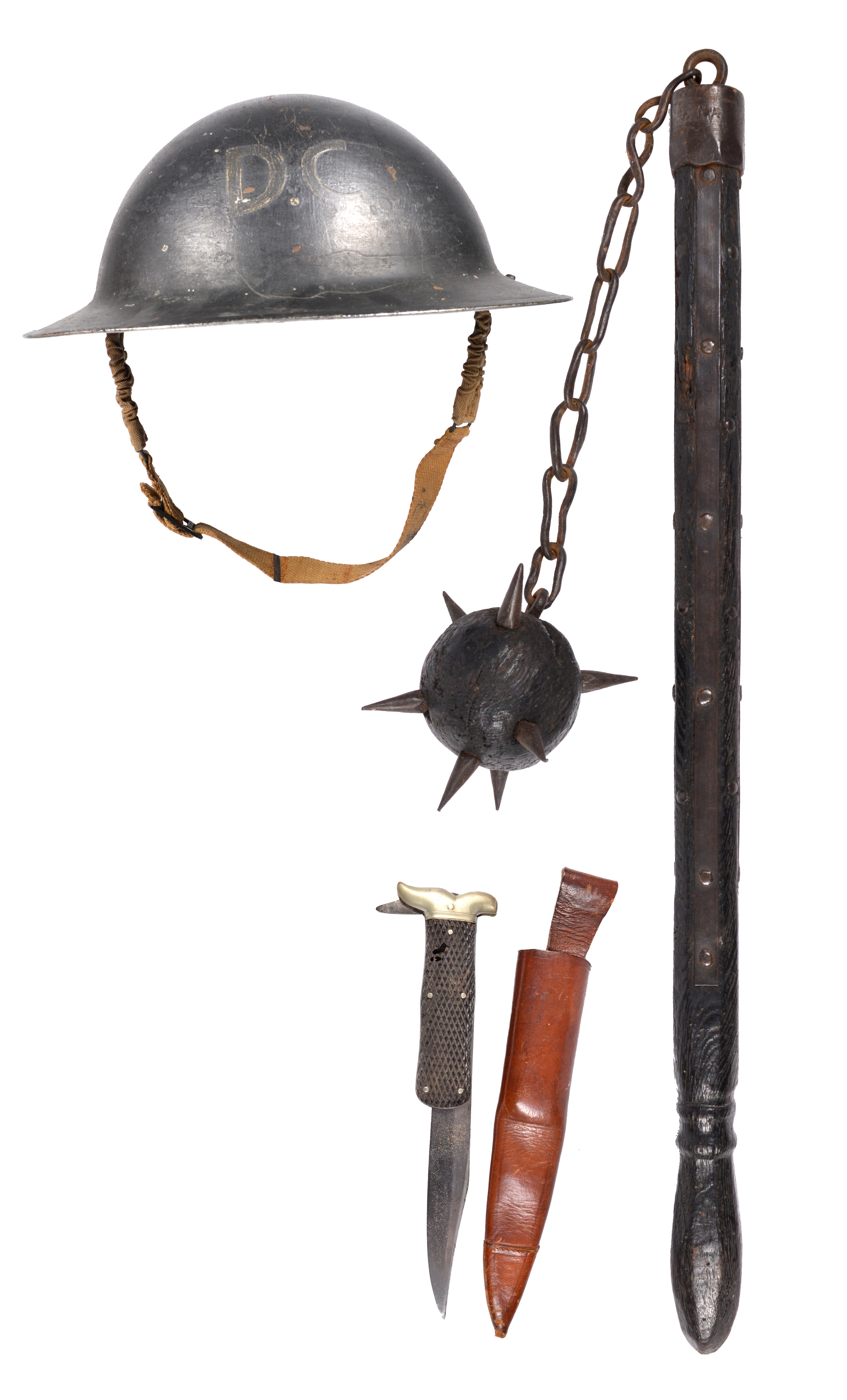 A military flail, or 'morning star', steel reinforced wooden haft (apparently adapted from an item of furniture), united by a short chain to a wooden ball set with seven iron spikes (possibly Great War German); together with a late 19th/early 20th Century bowie knife with folding handle, brown leather scabbard; and a WWII British brodie helmet. [3]