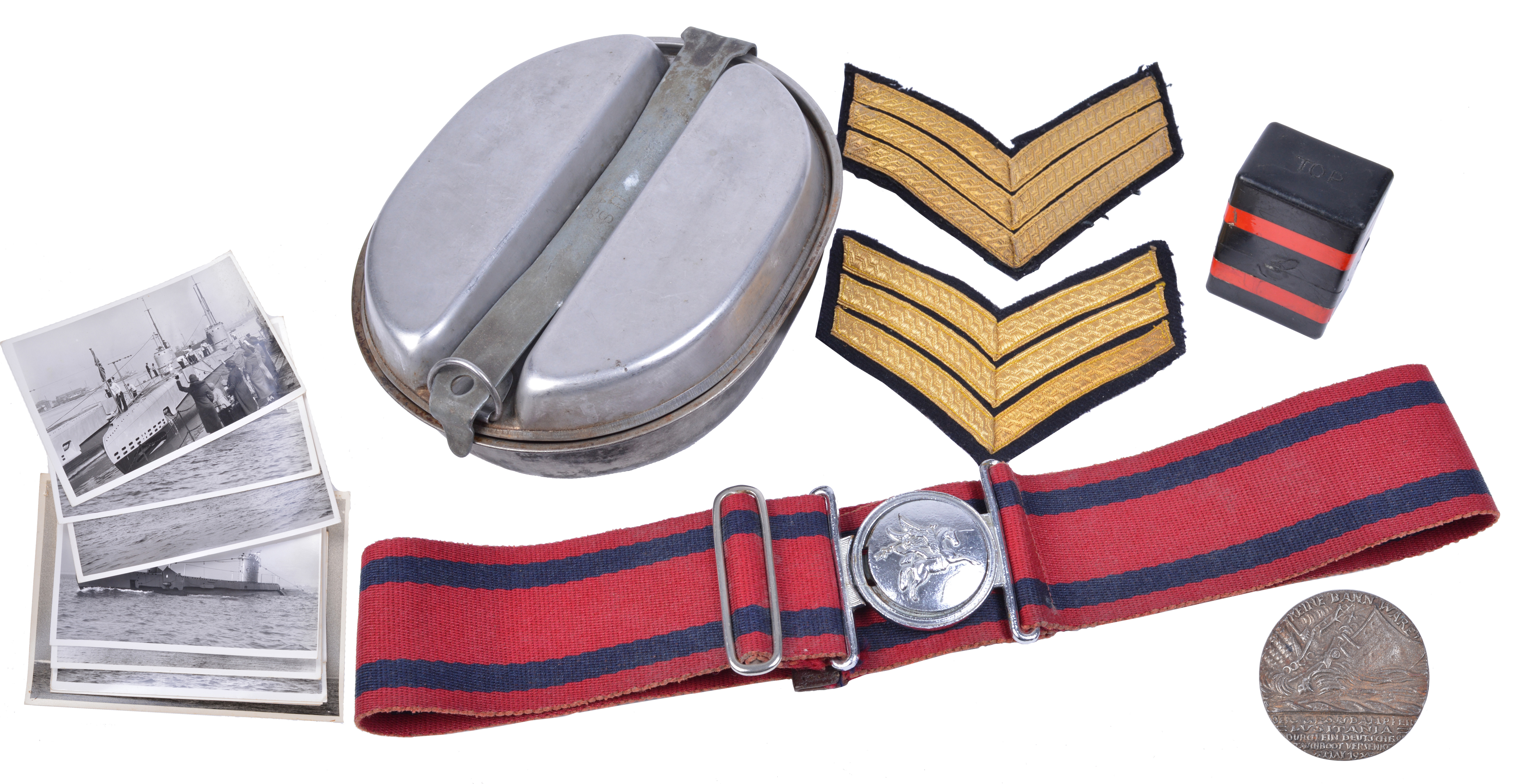 An assortment of militaria, including: a 9 Parachute Squadron Royal Engineers stable belt, a collection of associated fabric insignia, a quantity of photographs of British naval vessels, a detonator box, a U.S. mess tin set, and other items. [qty]