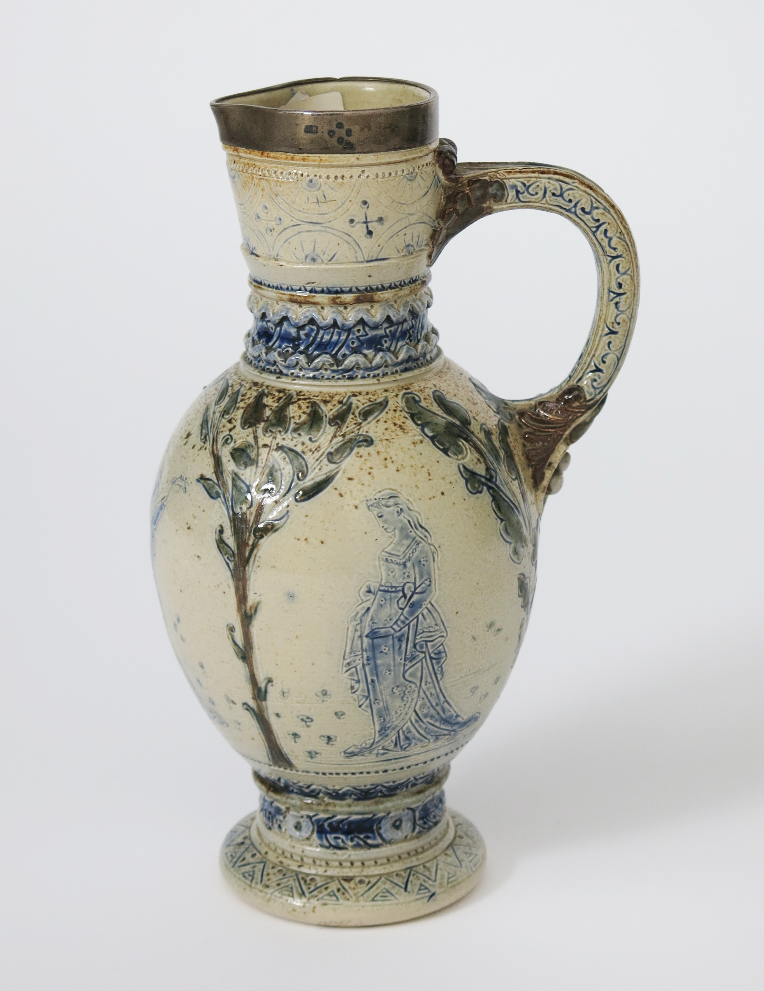An early Martin Brothers Medieval stoneware jug by Robert Wallace Martin, footed ovoid form with cylindrical neck, incised with two medieval maidens walking amongst stylised trees, another maiden playing music, between incised geometric bands, glazed green, blue and brown on a buff ground, with applied silver rim, incised R W Martin 7 MM Fulham 274, Richard Dennis paper label number 33, silver rim stamped JB hallmarks London 1873 23.5cm. high