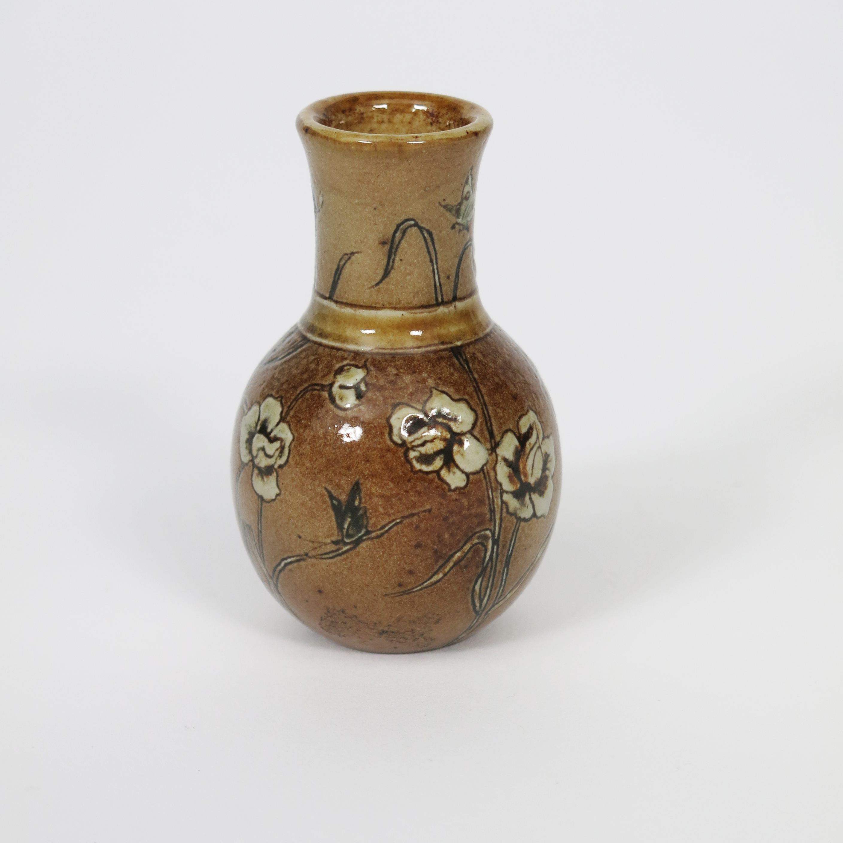 A Martin Brothers stoneware miniature vase by Edwin & Walter Martin, ovoid with cylindrical neck, incised with three butterflies flying past wild flower stems, in white, pale blue and ochre on a brown ground, incised Martin Bros London to base, 8cm. high