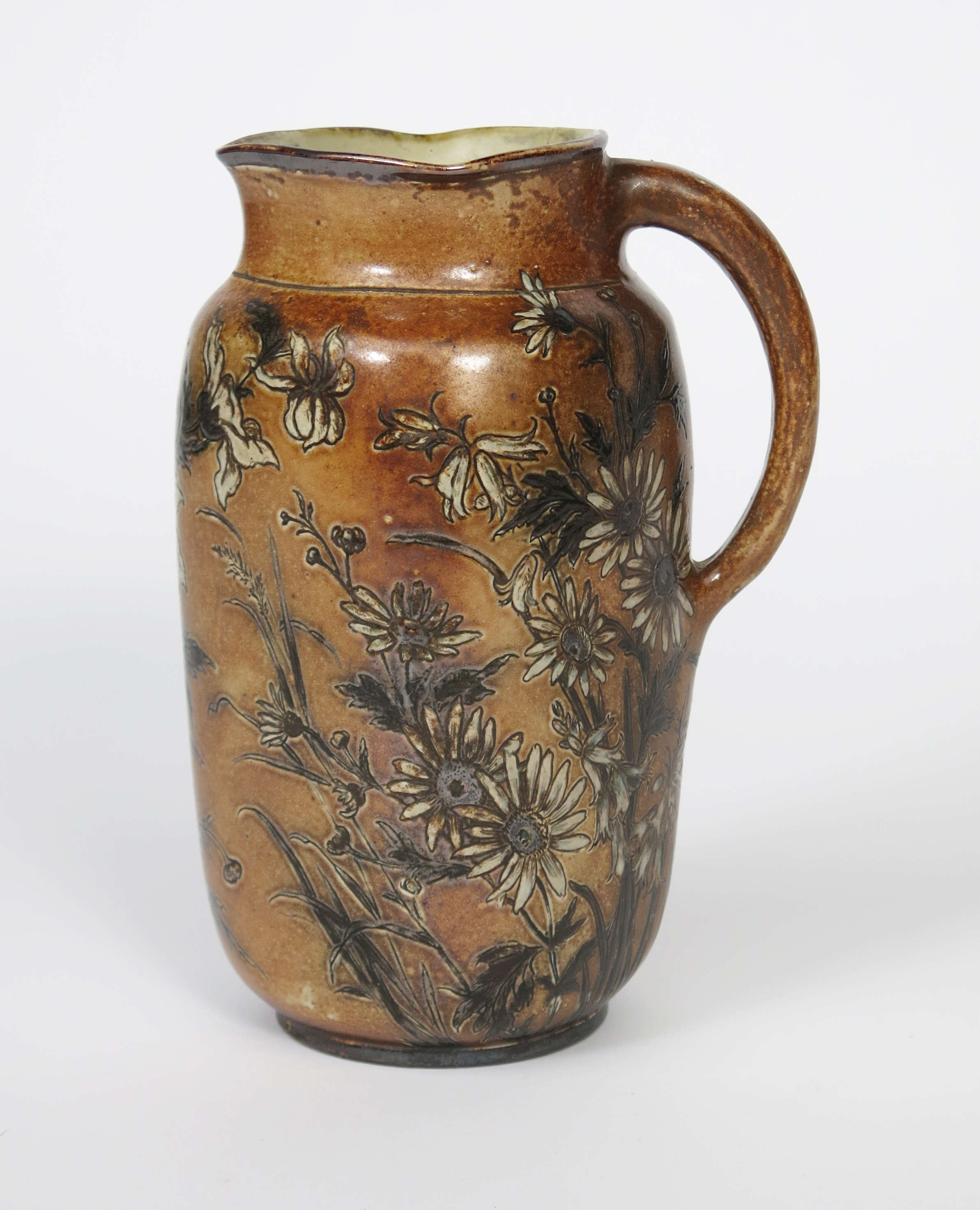 A Martin Brothers stoneware jug by Edwin & Walter Martin, dated 1895, shouldered square section, incised with stems of daffodils, dahlias and daisies, in white and brown on a buff ground, incised 10-1894 Martin Bros London & Southall, firing crack to rim, 24.5cm. high