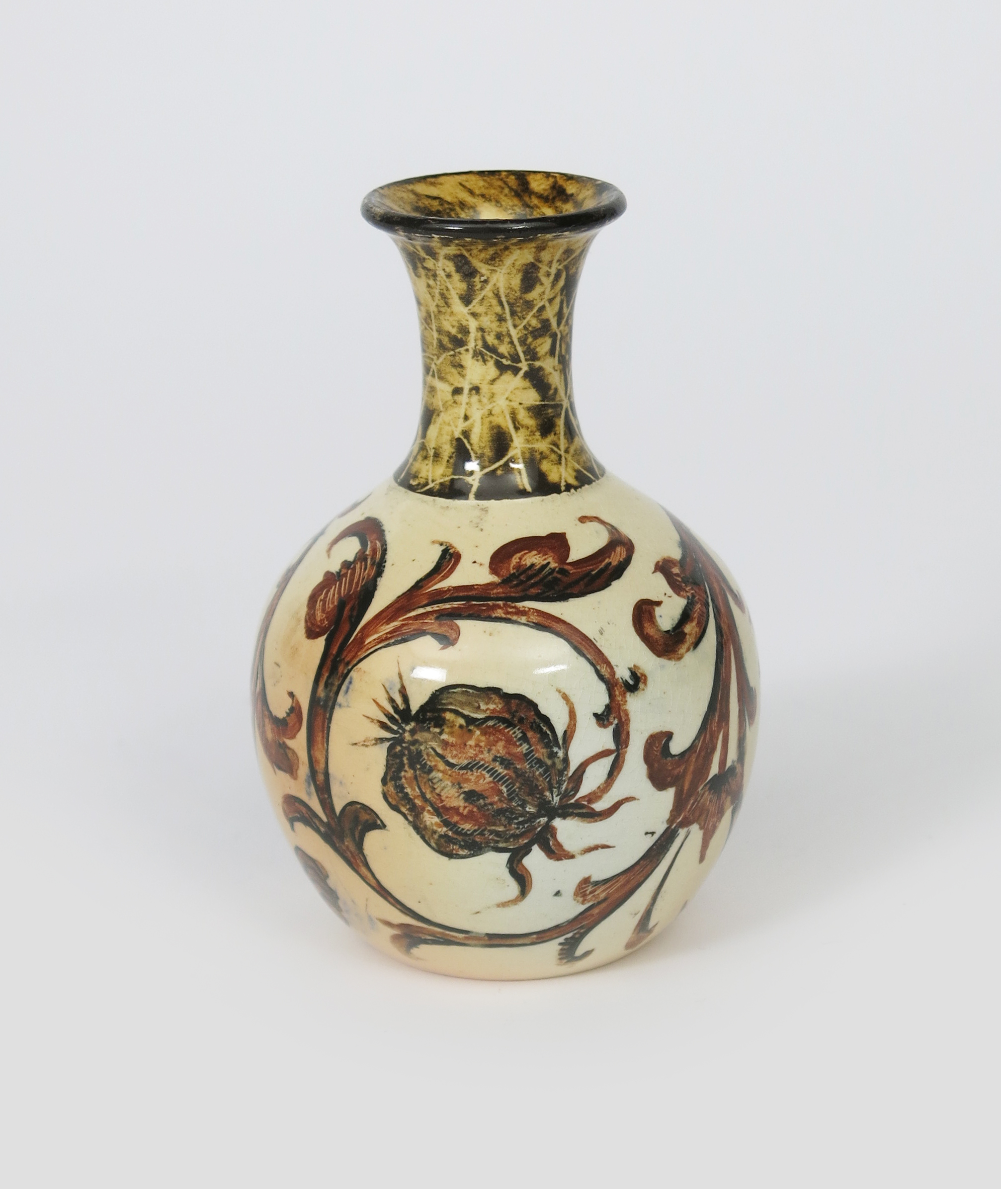 A Martin Brothers stoneware solifleur vase by Edwin & Walter Martin, dated 1894, ovoid with waisted neck, painted with scrolling flower stems in brown on a cream ground, incised 4-1894 Martin Bros London & Southall, 11cm. high