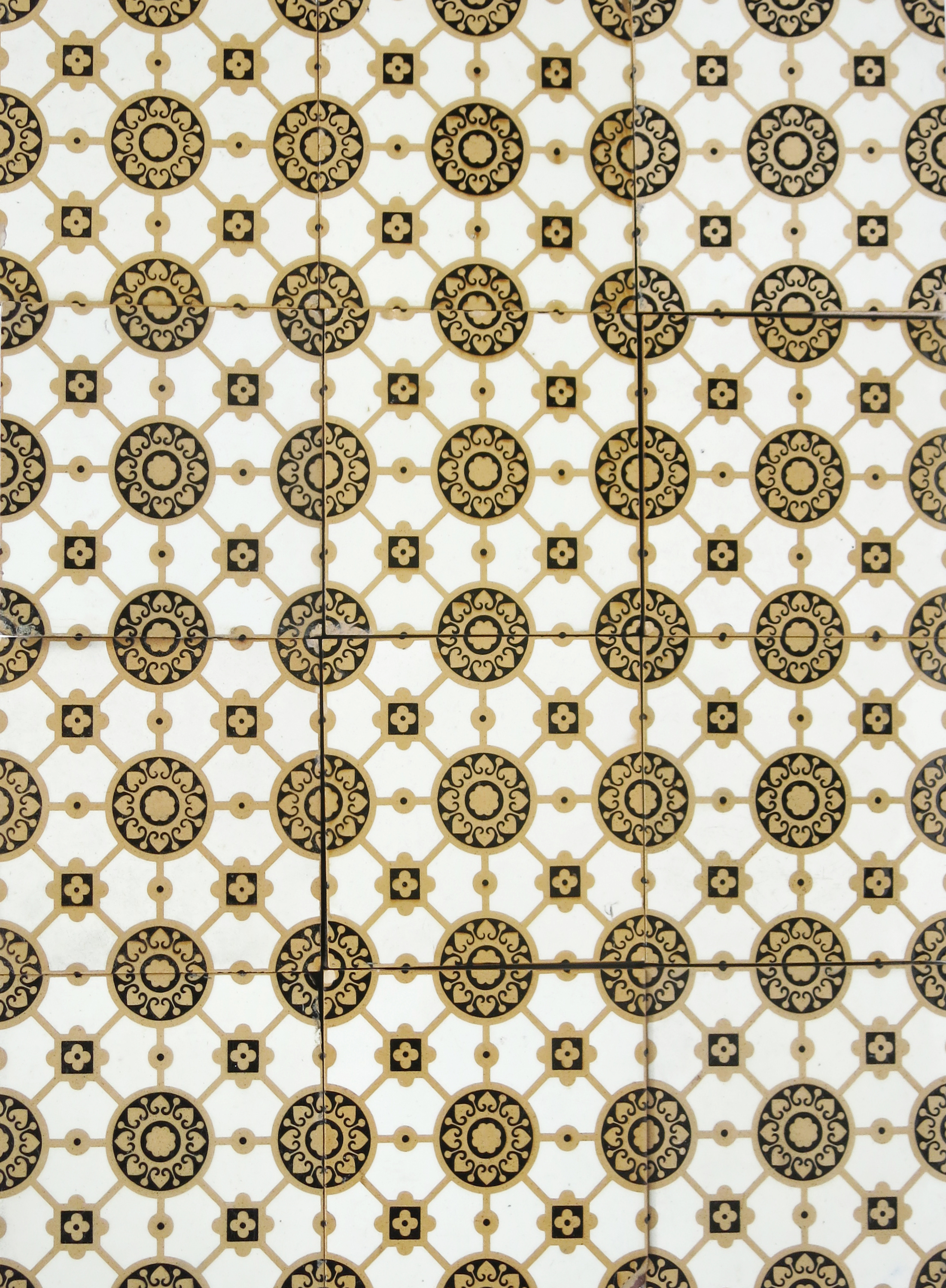 A collection of thirty-five Minton & Co tiles the design attributed to Dr Christopher Dresser, each decorated with a stylised flower roundel inside matrix design in black and sand on a cream ground, impressed marks, damages 15cm. square